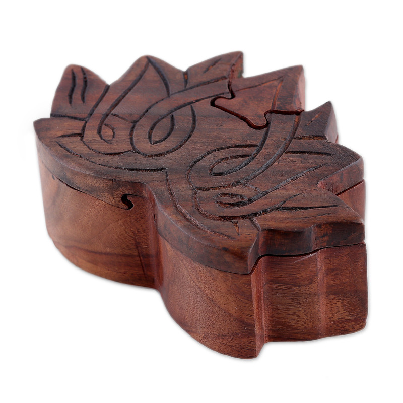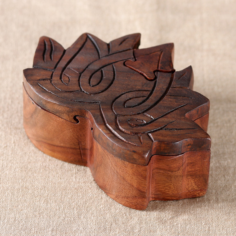 Keep your treasures secure under the sacred image of the lotus flower that decorates this design presented by Arti Sharma. Master Indian artisans honor the region's ancient traditions with this puzzle box made from refined mango wood. An elegant dark brown hue bathes the accessory, whose top boasts an embossed lotus of majestic vibes.