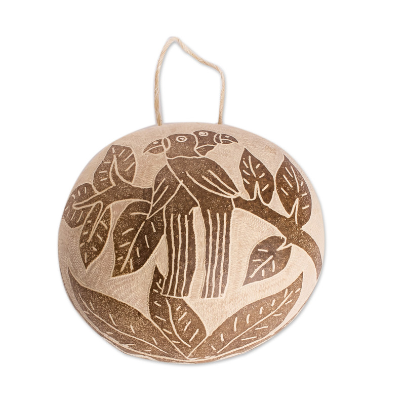 A couple of intertwined macaws resting peacefully on a tree branch is the theme for this dreamy wall art carved in dried calabash gourd. Warm your home with this decorative accent that hangs from an agave cord in a beautiful design by the artisans of Costa Rica's Guevara Cabalceta Family.
