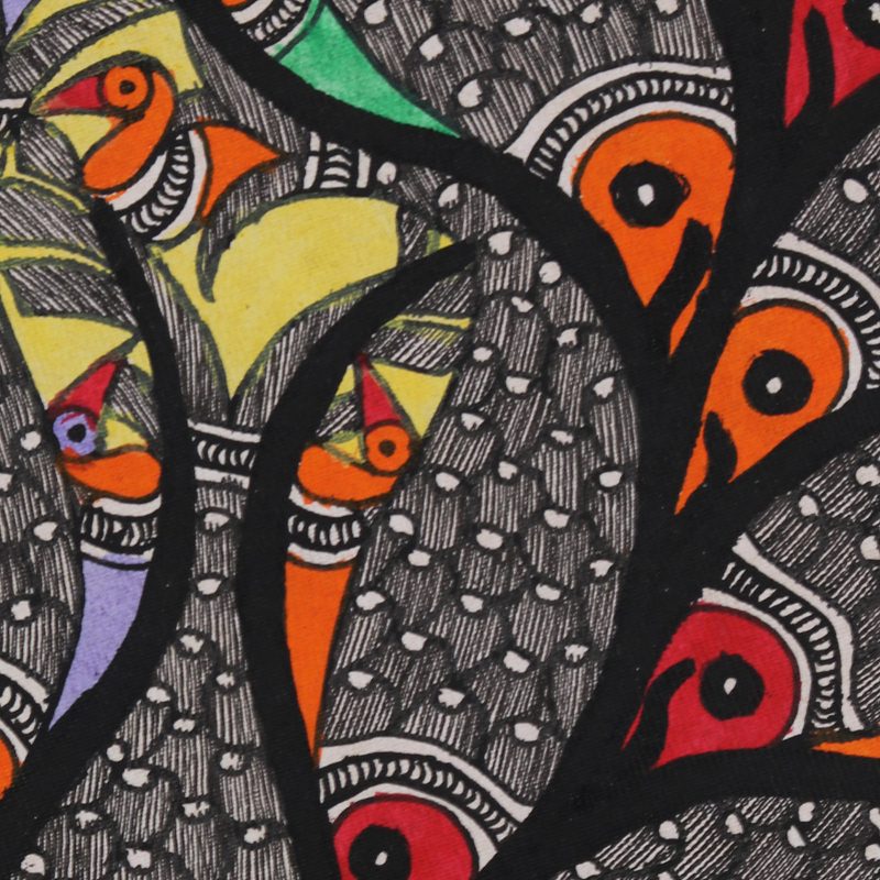 Resting on the branches of a black tree, colorful birds and fish are diligently painted by hand with vegetable dyes on handmade paper. Devendra Kumar Jha and Family create this painting in the traditional style of Madhubani art, which originates in the Mithila region of India and is typically reserved for women.