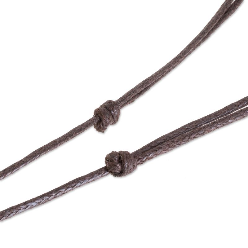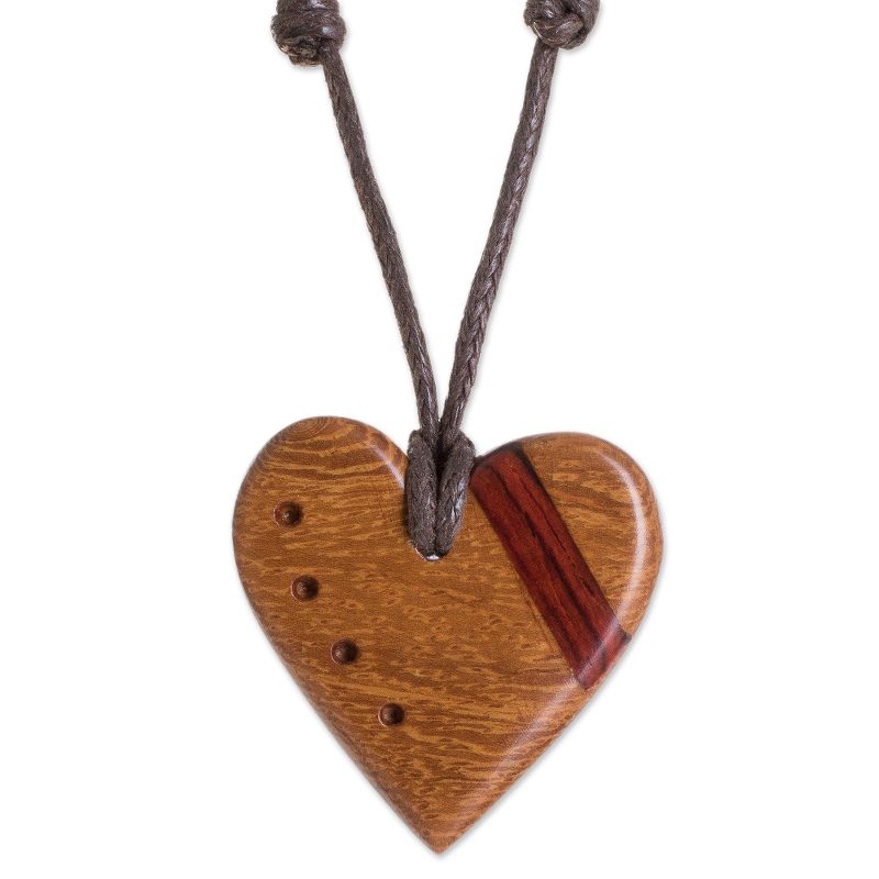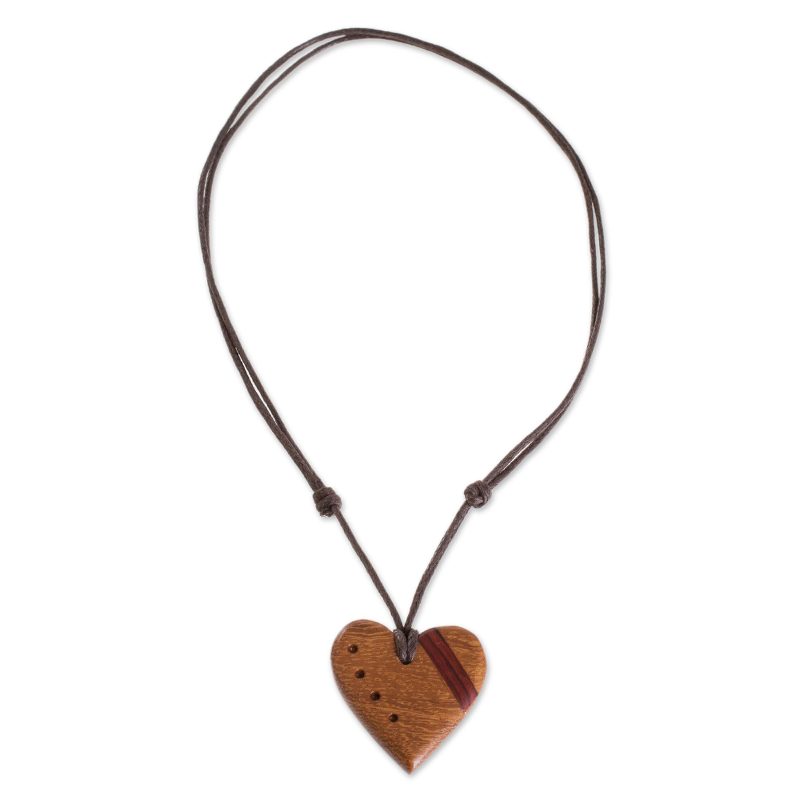 Decorated with a stripe of estoraque wood, a heart is hand-carved from madrecacao wood with a beautiful natural grain. Costa Rican artisan Milagro Cascante creates this love-inspired pendant necklace, which is decorated with four divots. This necklace circles the neck with an adjustable length of cotton cord.