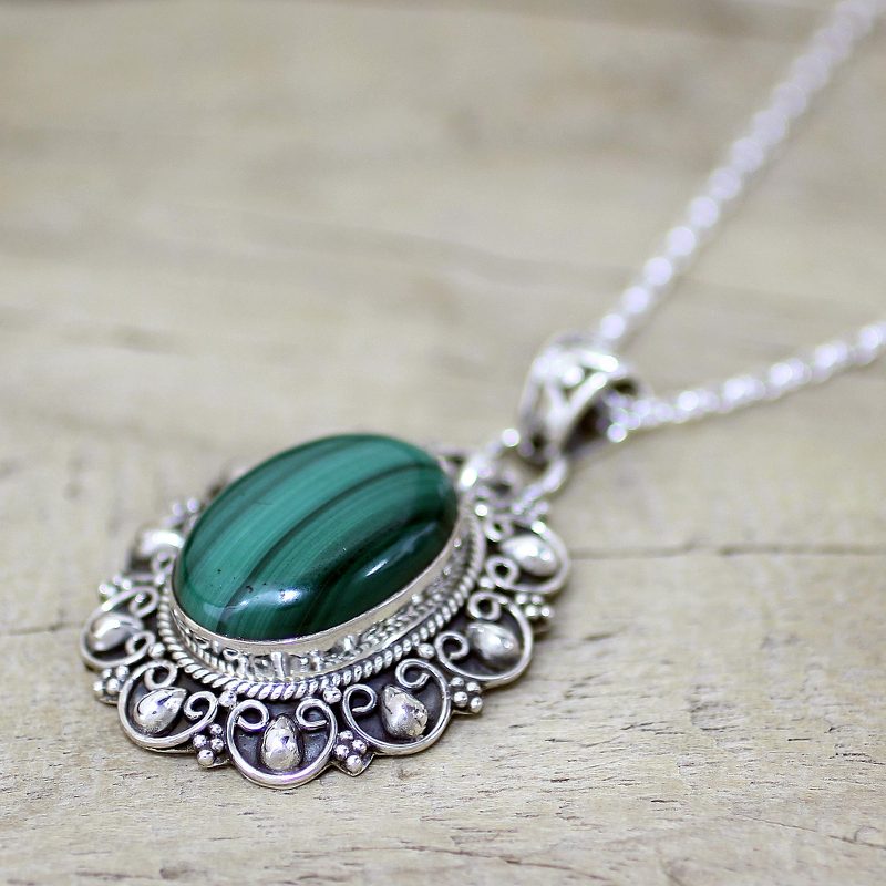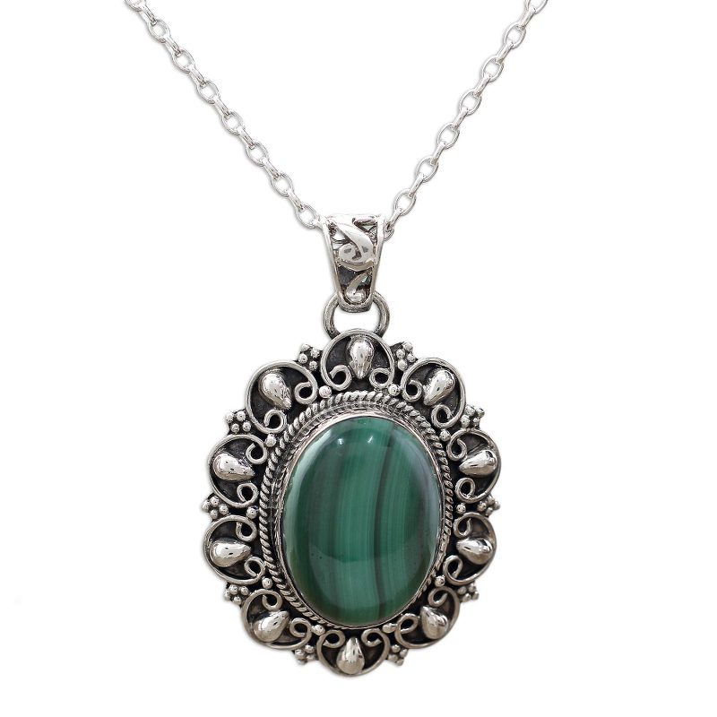 Indian artisan Alok Jain designs this sophisticated pendant necklace. Handcrafted from sterling silver, the intricately engraved pendant holds deep green malachite that is both elegant and alluring.
