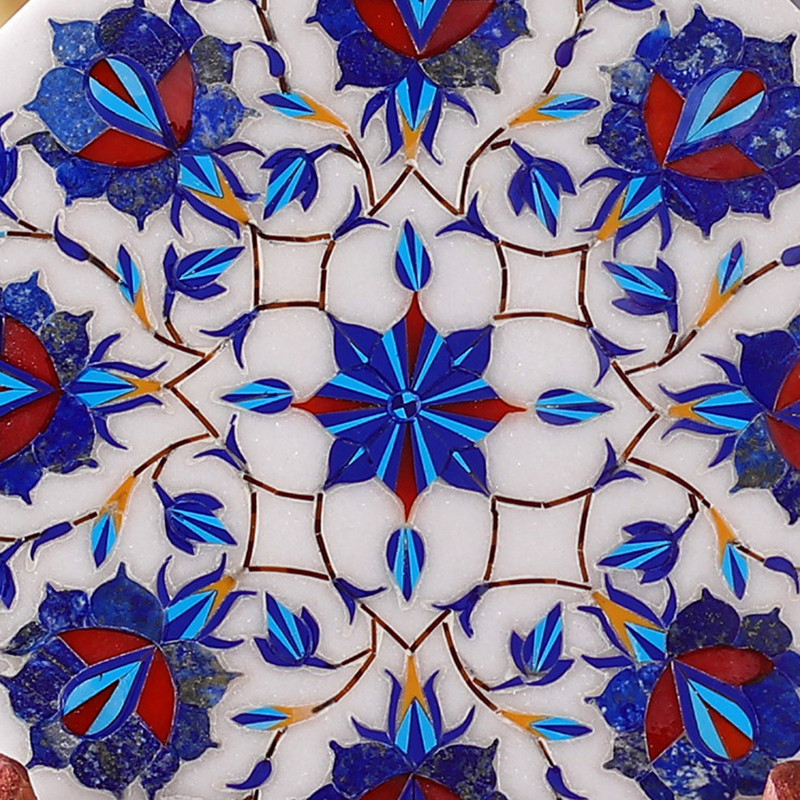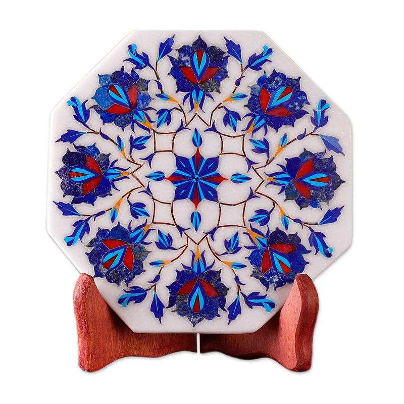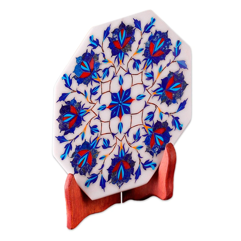 Backed by our 100% Happiness GuaranteeCapturing the beauty of the artisan's imagination, this octagonal decorative plate features intricate floral motifs. In the style of decorations found at the famous Taj Mahal, the blue floral motifs are diligently carved by hand into marble, inlaid with around 700 pieces of colorful resin. Imran designs this beautiful plate, displayed on a mango wood stand.