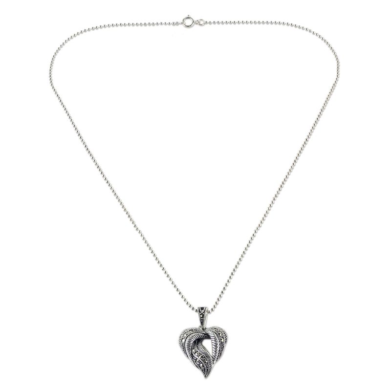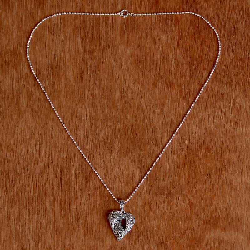 An intricate leaf hangs from a length of ball chain, crafted from sterling silver in an elegant, twisting shape to capture the heart of the forest. Narinee designs this necklace, paving the pendant with petite stones of marcasite for a glistening look.