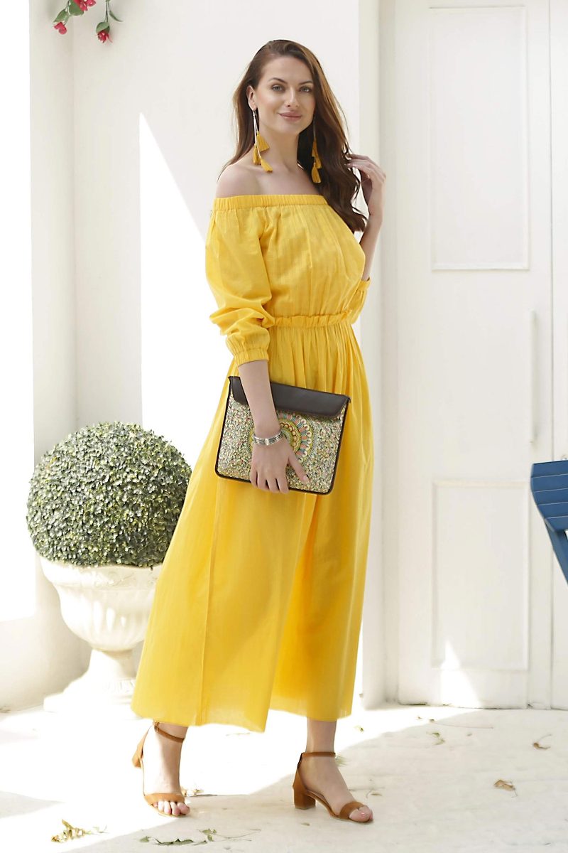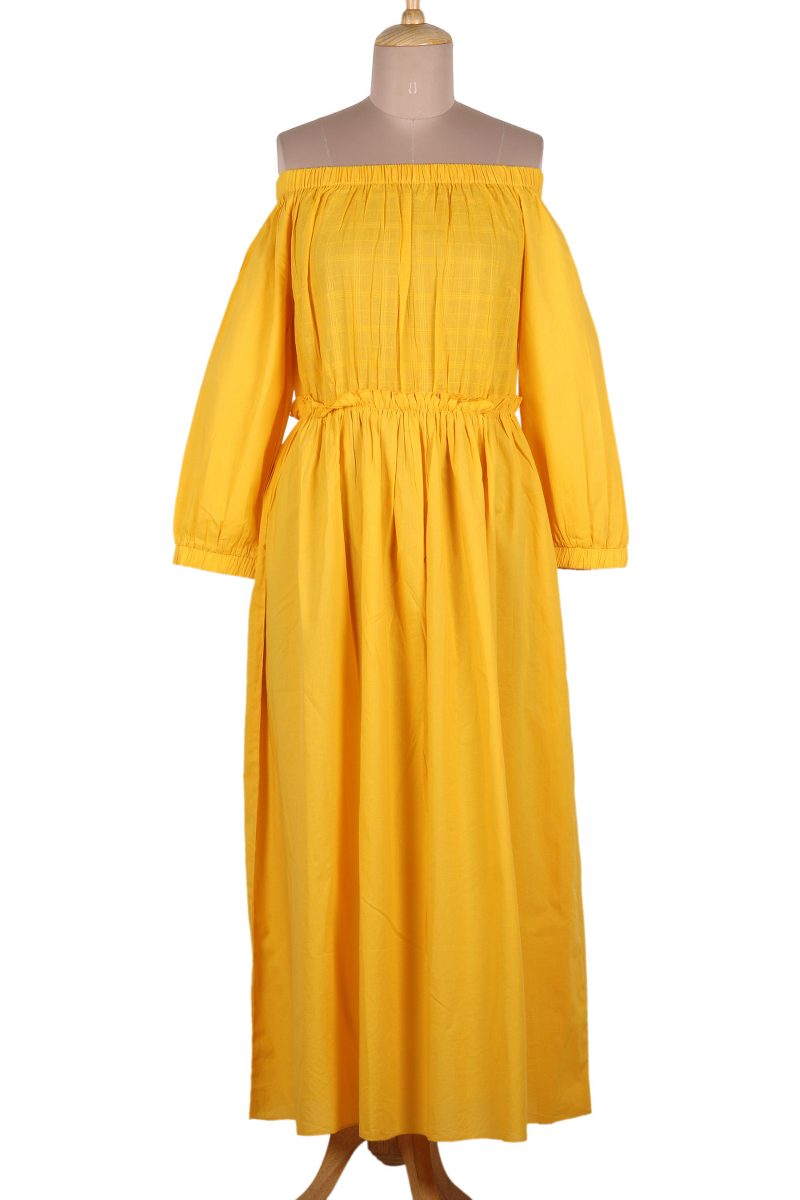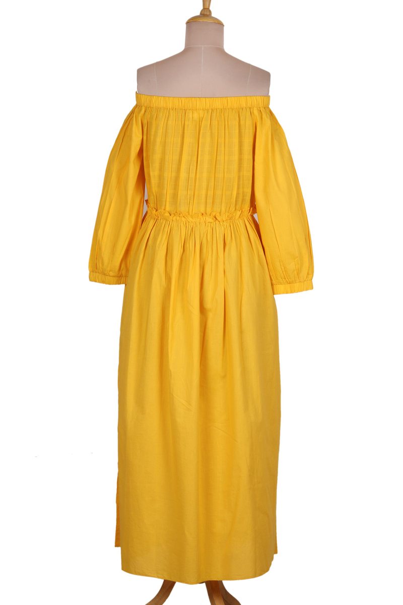 You can find our cotton off-shoulder maxi dress 'Marigold Muse' by Shashi Sehgal in clothing categories such as Bohemian Dresses, Cotton Dresses and A-line Dresses. Enjoy exploring these sections for other Novica treasures.