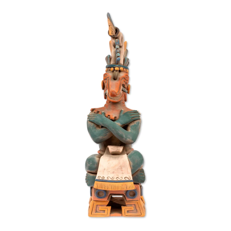 Backed by our 100% Happiness GuaranteeChaac, the Maya lord of rain, sits on his throne with arms crossed in front at his chest, regarded as an unusual depiction for this deity which artisans from the Angel Cerón Artisan Association replicate from a sculpture dated 250-800 AD. This anthropomorphic image fuses reptilian or amphibian characteristics with that of an elderly human. The artisans sculpt this ceramic piece with sublime detail, including a throne separately from the sculpture.