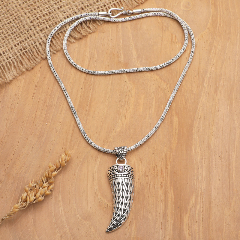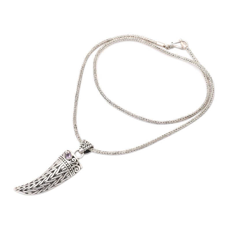 Discover the captivating allure of Balinese culture with this striking sterling silver pendant necklace for men emblazoned with intricate traditional Indonesian motifs. The fang-shaped pendant is made even more remarkable by the breathtaking amethyst gemstone that sits atop it. The naga chain completes the luxurious feel of this stylish design presented by Komang Wijayana.