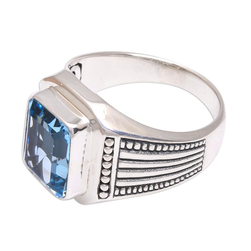 Designed by Bali's Putu Gede Darmawan, this men's ring will make a striking accessory wherever it goes. The ring is crafted of sterling silver, its band elaborated with line and dot patterns. A single stone of blue topaz, weighing 5.5 carats, is featured at the front of the ring.