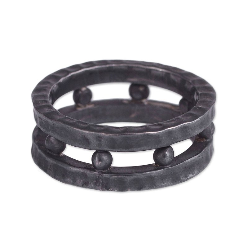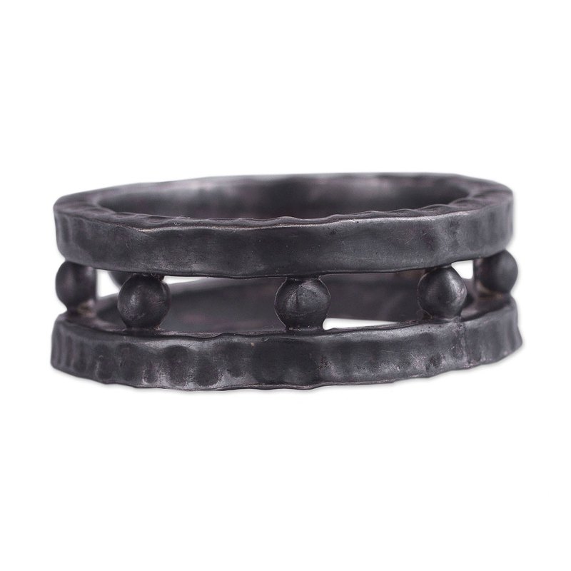 Backed by our 100% Happiness GuaranteePossessing the masculine energy of Thor, this men's band ring is designed by Peru's Rosa Tomatis. She works with local artisans, who craft the double bands of oxidized sterling silver, accentuated with round baubles in the middle.