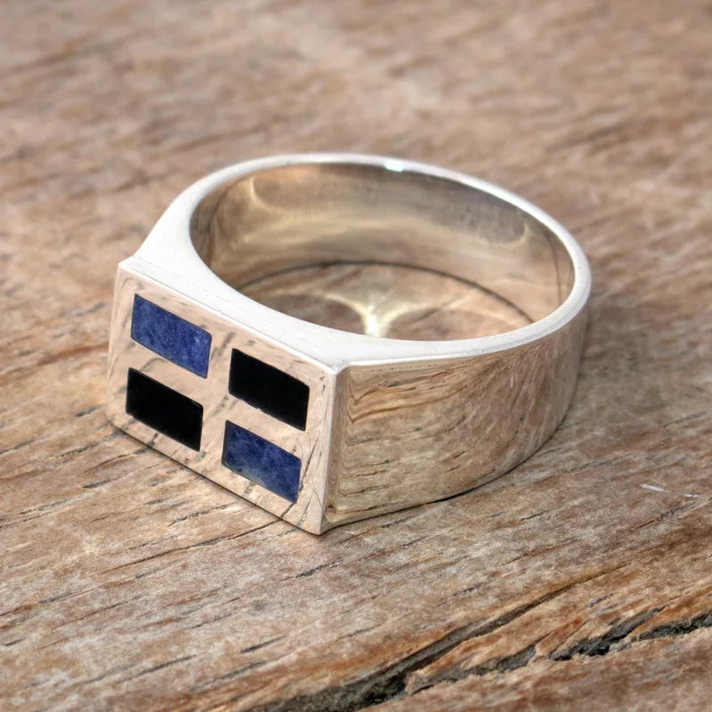 Backed by our 100% Happiness GuaranteeThis handsome men's signet-style ring from Carmen Granados in Peru is crafted from gleaming Andean sterling silver. The flat crown features inlaid rectangles of blue sodalite and jet-black obsidian.