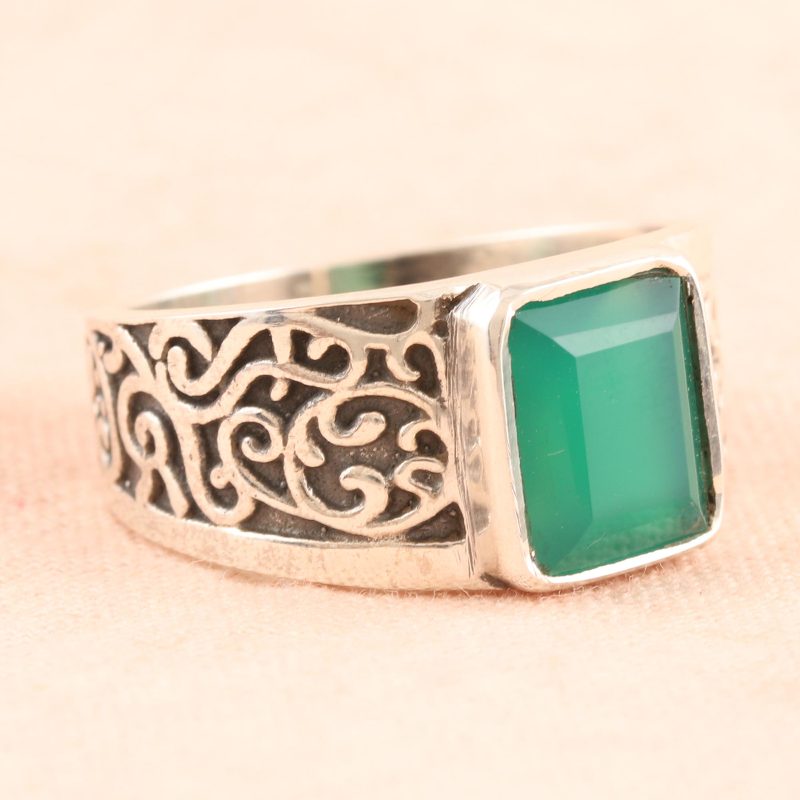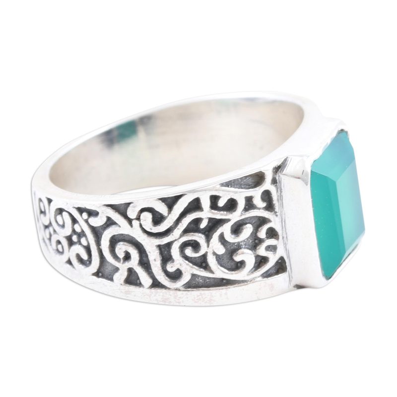 Cultivate an aura of quiet strength with help from this handsome cocktail ring from India's Parul. The artisan centers the ring with a large onyx gemstone, dyed a rich, eye-catching green. A swirling pattern covers the ring's thick, sterling silver band, adding an interesting textural element.