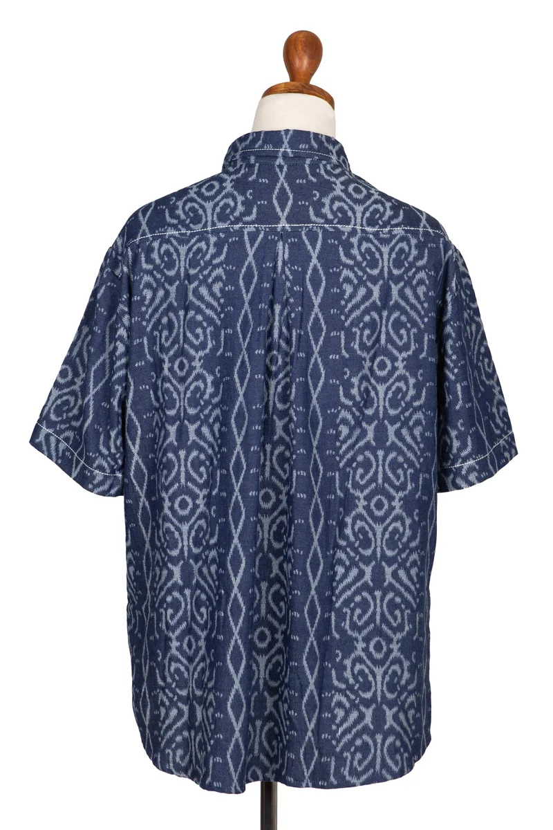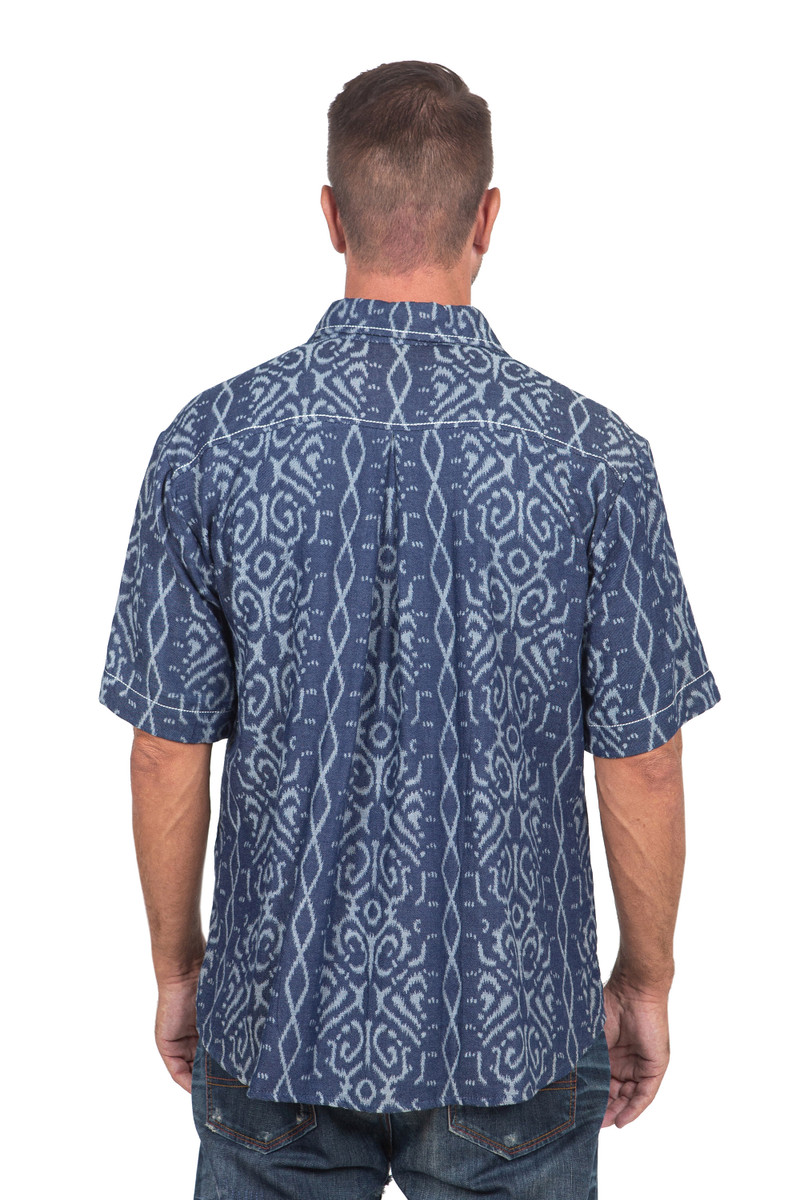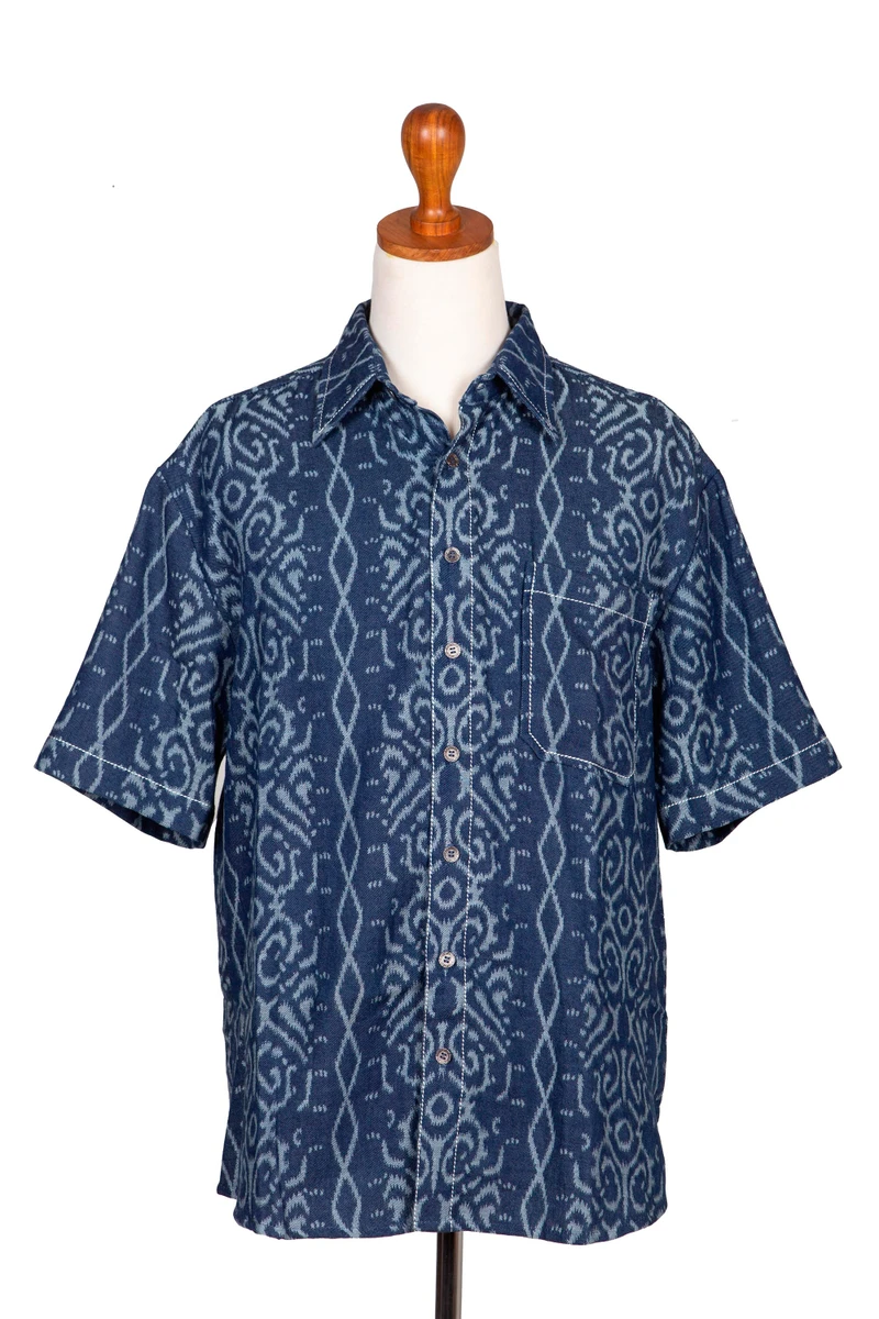 This relaxed men's shirt by Dani Paraswati is a modern take on Indonesia's traditional ikat weave technique. Handcrafted from mid-weight 100% cotton denim, the short sleeved shirt features an ikat style jacquard that is woven into the fabric. The single pocket shirt features Dani's signature contrast chunky stitching and is finished with black nickel buttons.