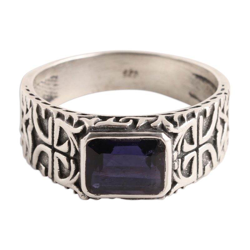 Parul of India presents a captivating men's single-stone ring. A captivating faceted rectangle of iolite is set in a wide sterling silver band. Oxidation is artfully applied to bring out the intriguing abstract motif in the sterling silver ring band.