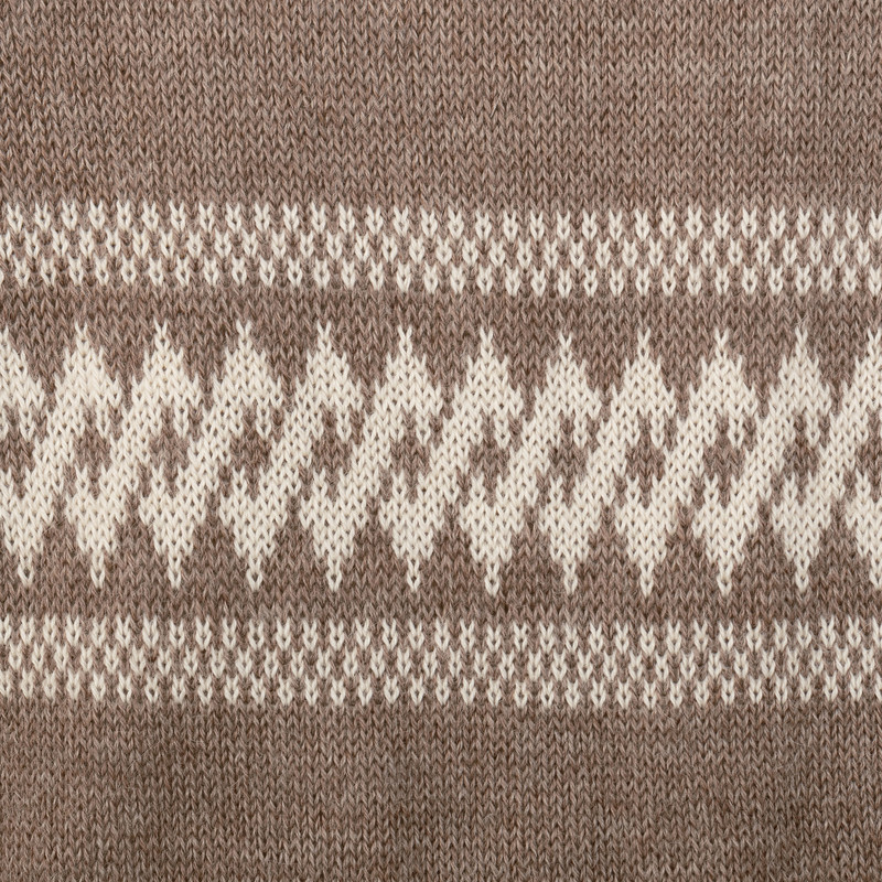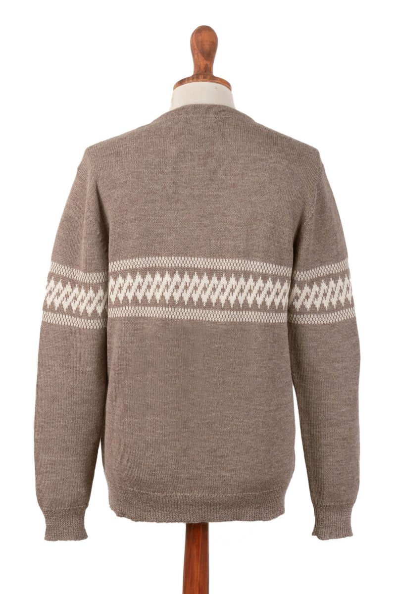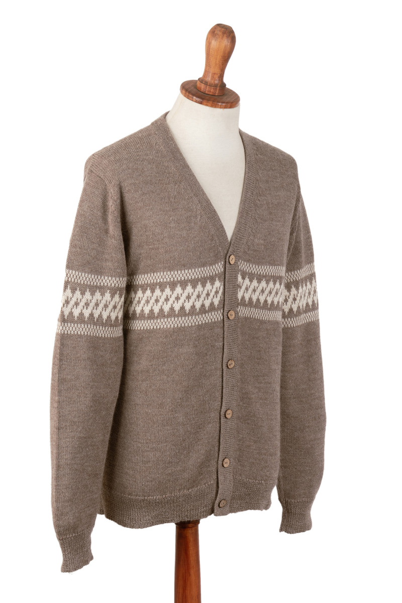 Backed by our 100% Happiness GuaranteeKnitted in Peru on a manually operated knitting machine, Maritza Oviedo's cardigan merges dapper Andean style with comfort. Made from 100% baby alpaca yarns in light taupe, and accented with an ivory geometric pattern across the chest and sleeves. The design features a V-neckline, a button-up closure, long sleeves and ribbed cuffs and hem.