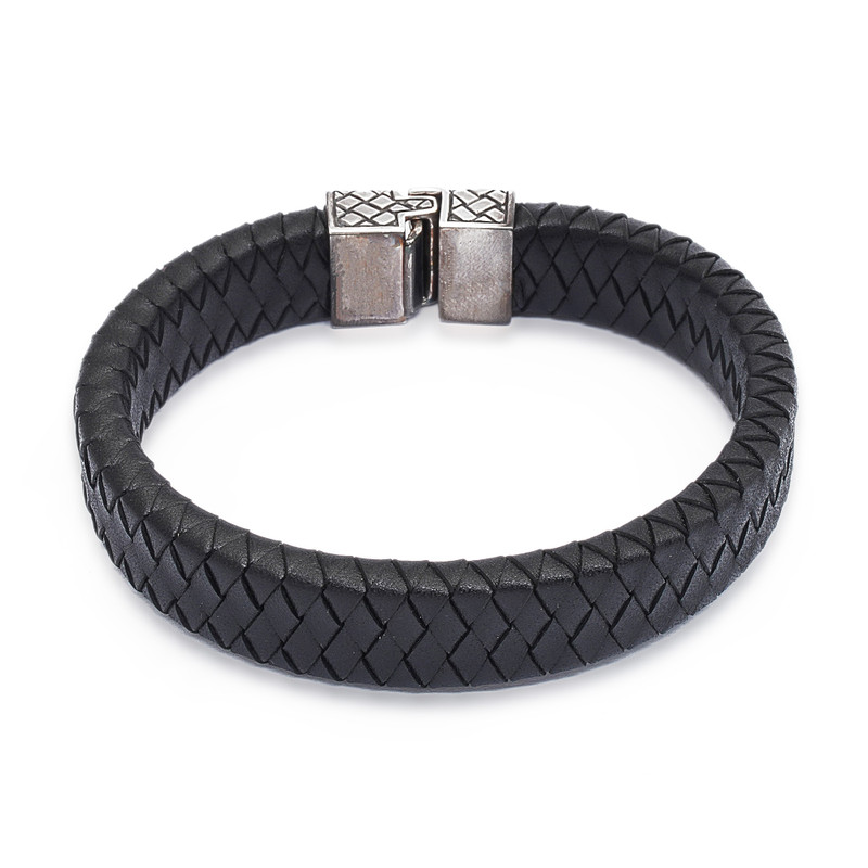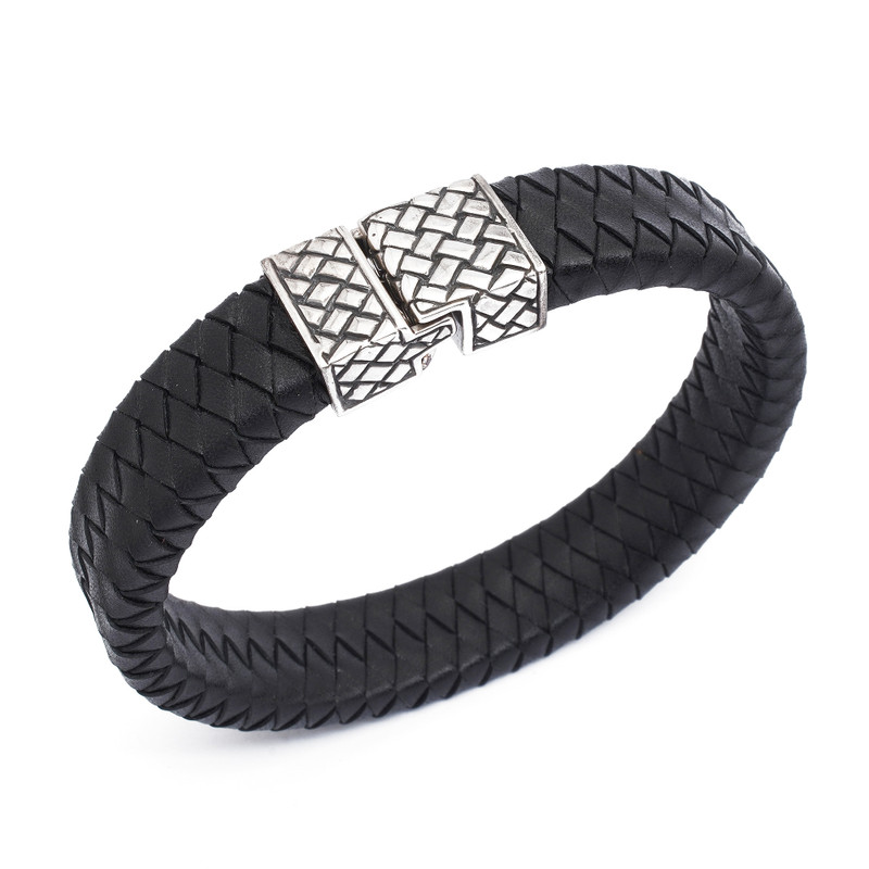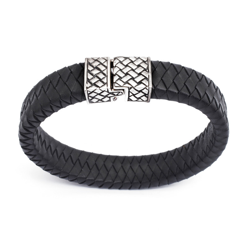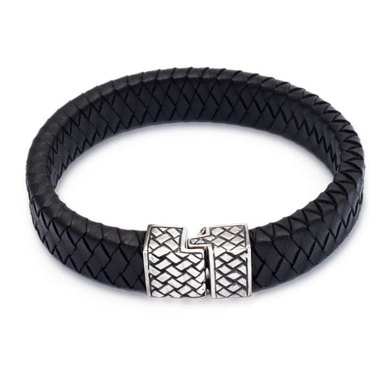 Henry Anthony Sanny braids a wide band of black leather to symbolize masculinity. The bold men's bracelet closes with a sleek silver clasp.