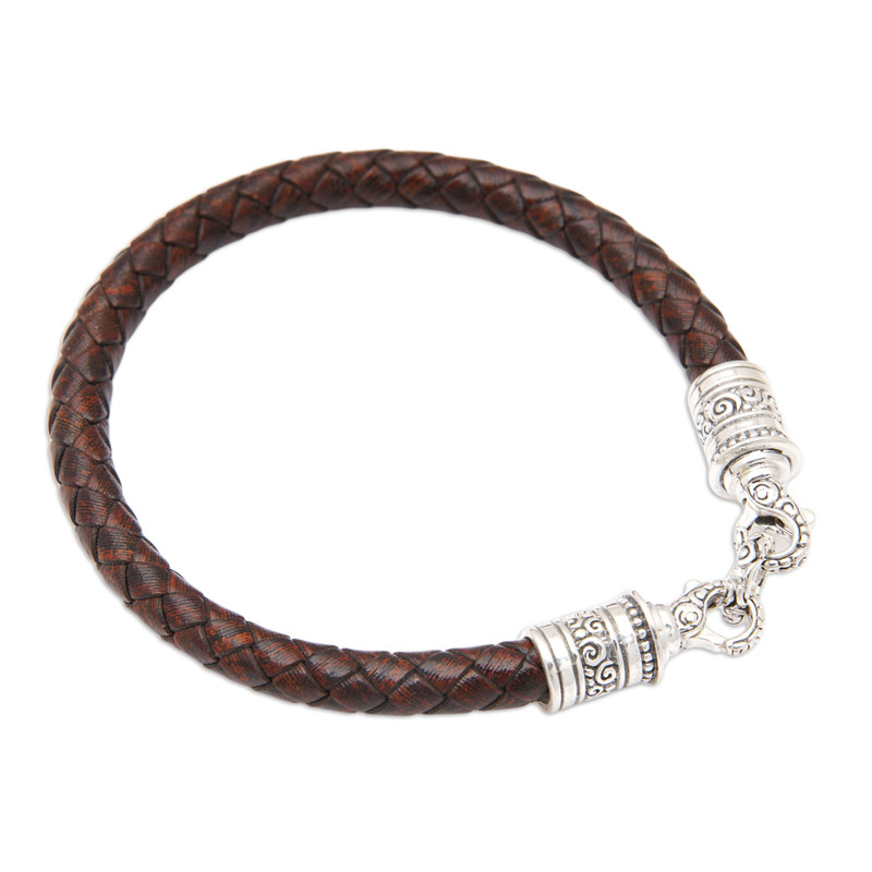 Zayd Makarim, a Javanese artisan living in Bali, designs a fashionable men's leather braided bracelet that catches the eye. Its sterling silver accents and lobster claw clasp closure feature textured "Buddha curl" motifs, Makarim's take on traditional Balinese designs.