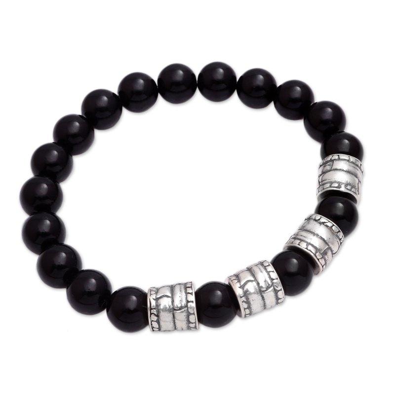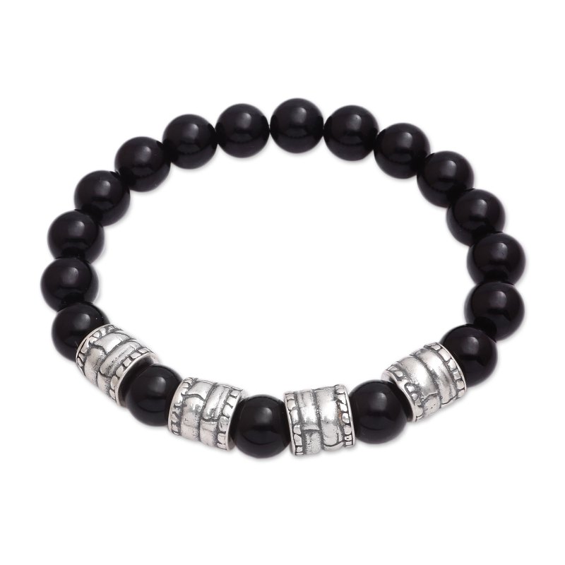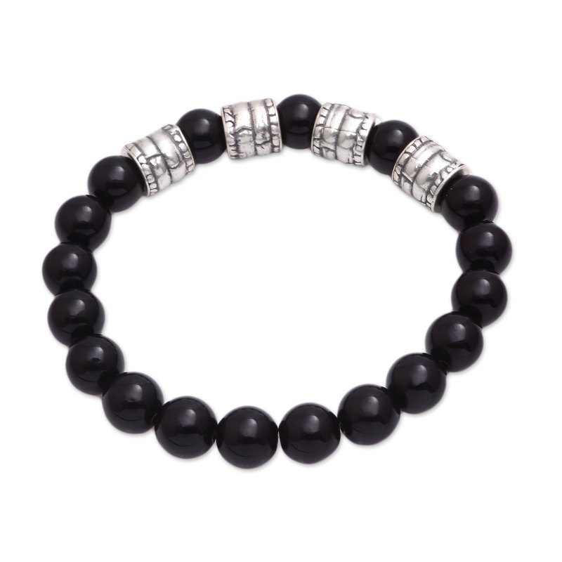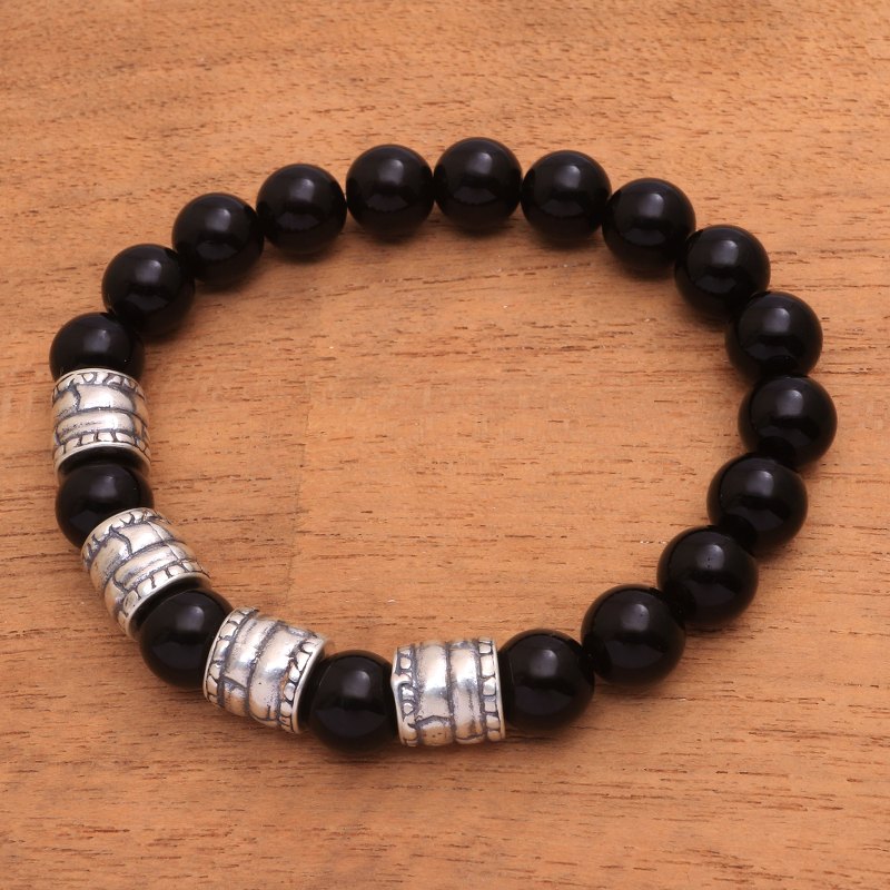 By Balinese artisan Asmara Putra, this men's stretch bracelet circles the wrist with shining beads of black onyx. Four sterling silver beads accentuate the bracelet, given a combination of finishes.