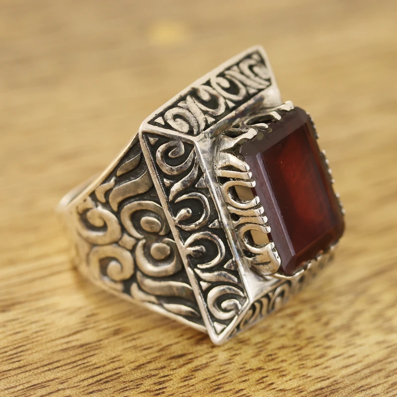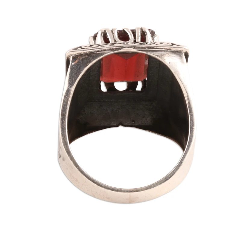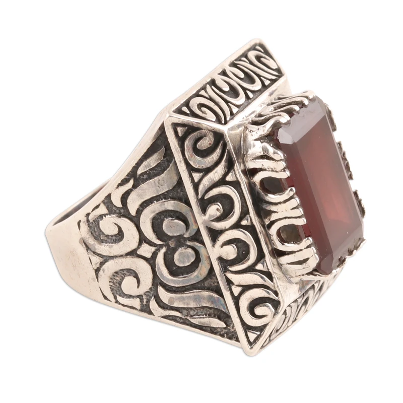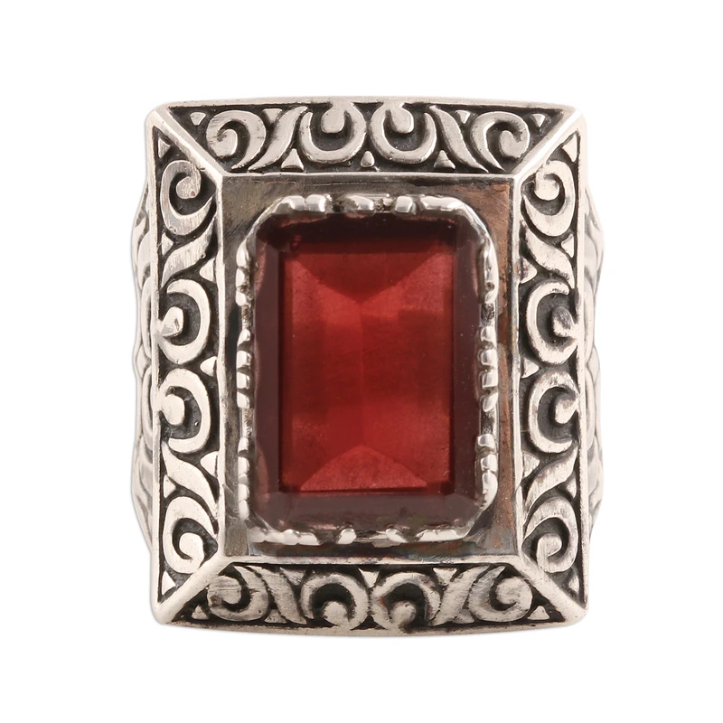 Framed by intricate swirl patterns in combination-finish sterling silver, a six-carat rectangle of garnet glows with natural reddish hues. Parul presents this men's ring from India, which circles the finger with a patterned sterling band.