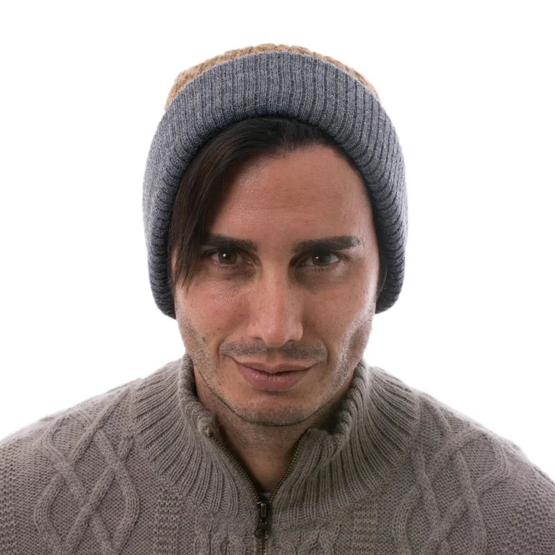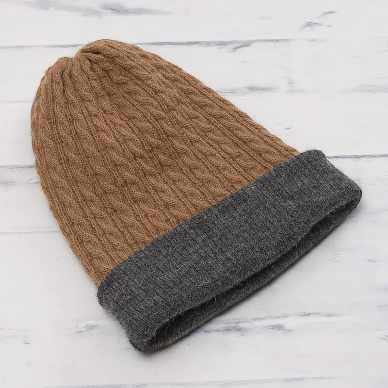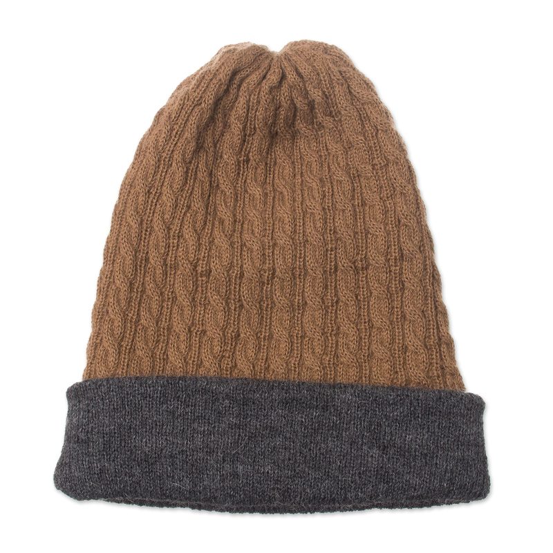 This terrific hat features gunmetal and saddle brown tones, great neutral colors, and it's reversible so you get options for how to wear it. Artisan Waldo Berrios, a native of Huancayo, Peru, crafts the warm cable-knit hat in a soft alpaca, acrylic, and wool blend.