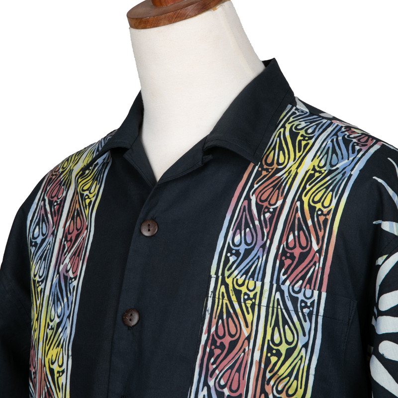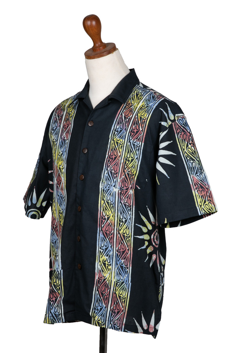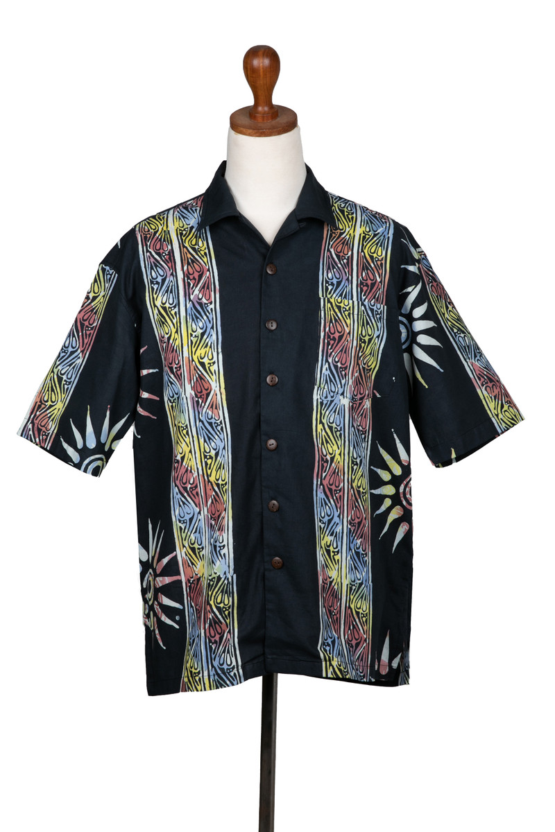 Unveil the true essence of style with this button-down cotton shirt for men designed by Bali's Desak Nyoman Parwati. A harmonious fusion of traditional artistry and modern aesthetics, it proudly showcases intricate patterns and chakra-inspired motifs crafted through time-honored hand-stamp batik technique. Adorned with elegant coconut shell buttons and a convenient chest pocket, the black base color is complimented with muted rainbow accents.