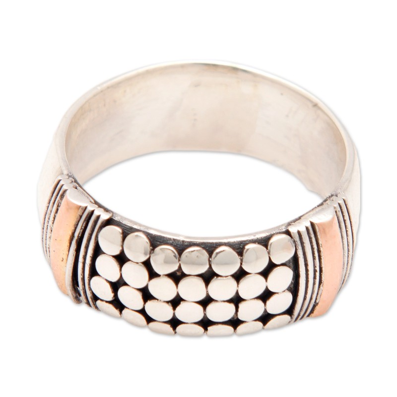 Emanating timeless elegance, this remarkable gold-accented sterling silver band ring for men seamlessly blends streaks and a charming polka-dot design. Presented by Bali's Komang Wijayana, this accessory features a combination of oxidized and polished details, making it an absolute must-have.