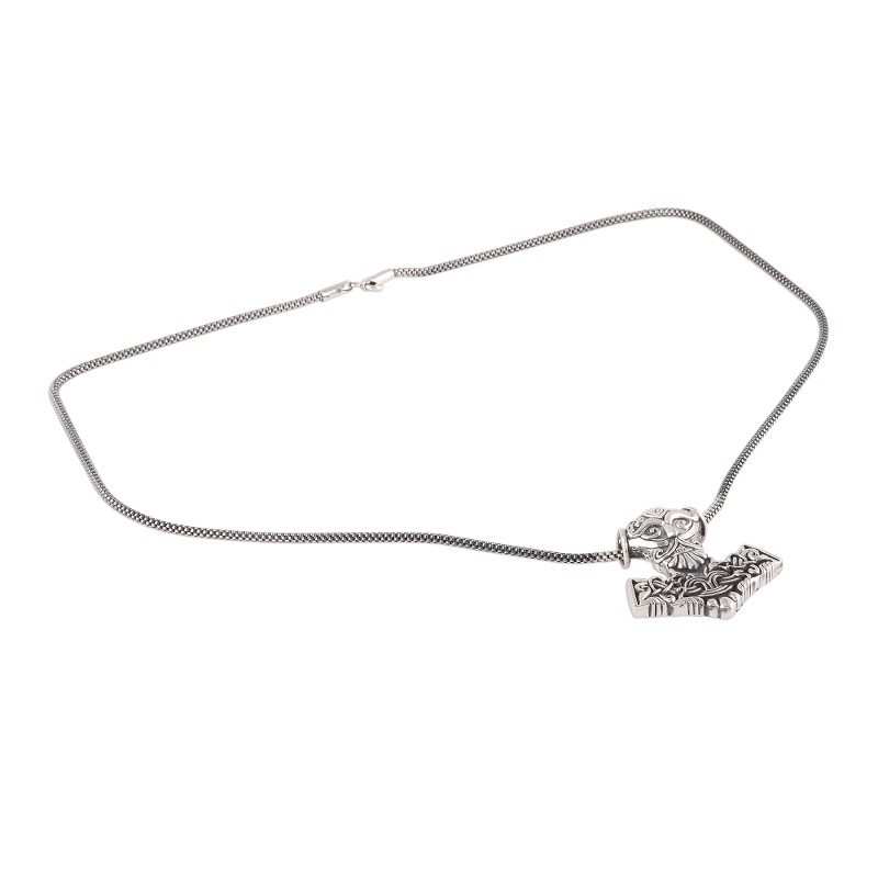 Backed by our Happiness GuaranteeRugged and bold, this pendant necklace from India is the perfect accessory for the contemporary man. Crafted from sterling silver, the iconic shape of Thor's hammer is detailed with intricate knot patterns, accentuated by a combination of finishes. At the top of the hammer, the stylized image of Thor himself, is realized. Shivani Choudhary designs this masculine necklace.