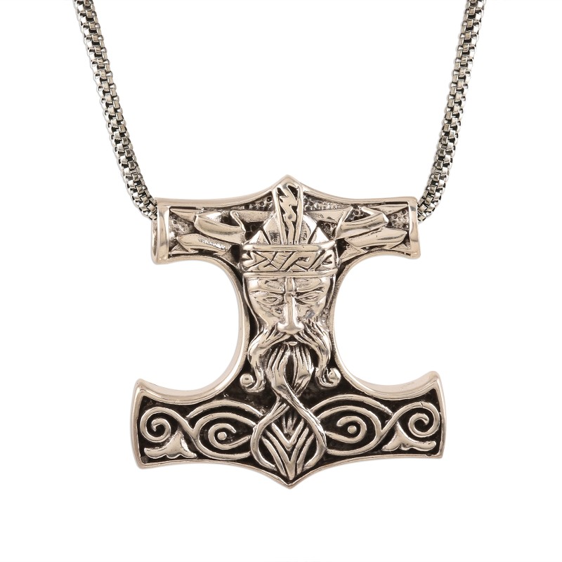 This intriguing men's necklace is designed by India's Shivani Choudhary. The pendant is shaped like the hammer of Thor, the Norse god associated with thunder. According to Norse mythology it was one of the most powerful weapons in existence. Crafted of sterling silver, the pendant features the visage of Thor himself, as well as some lightning bolts. The pendant centers a wide sterling silver box chain.