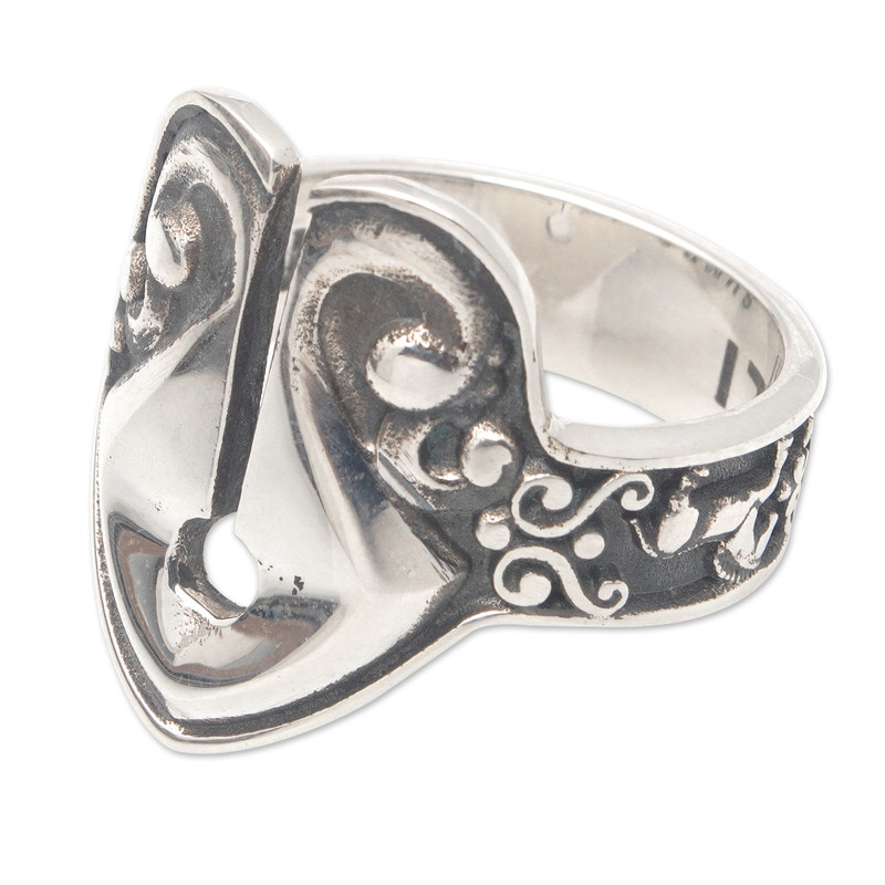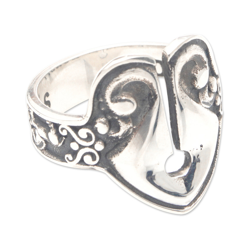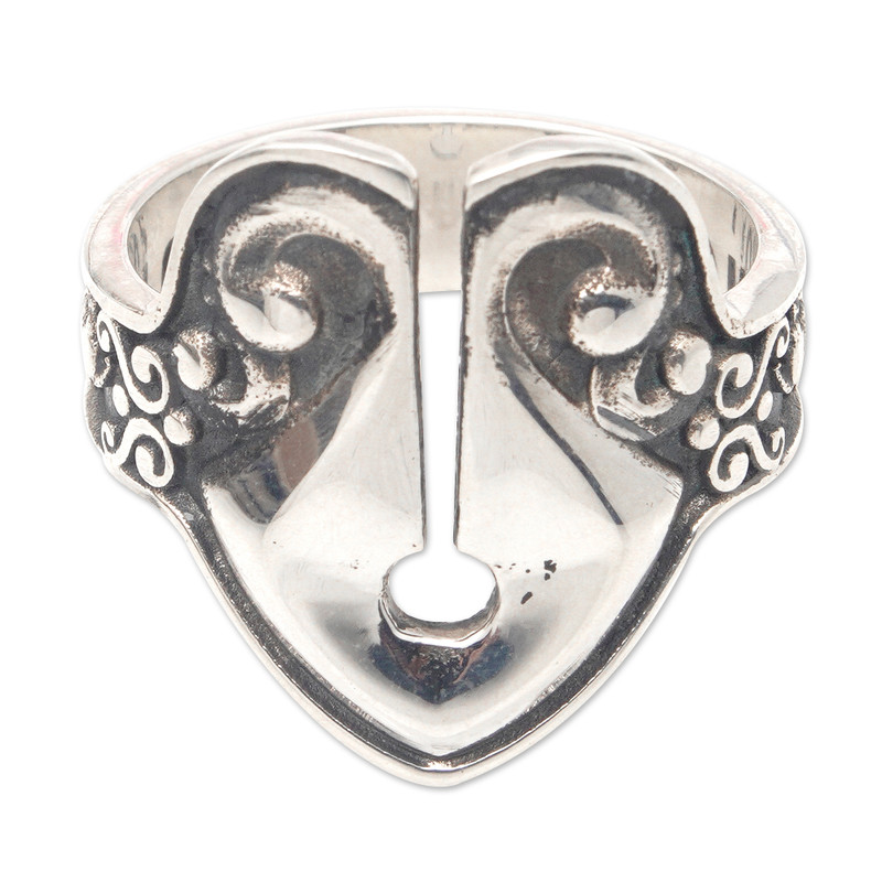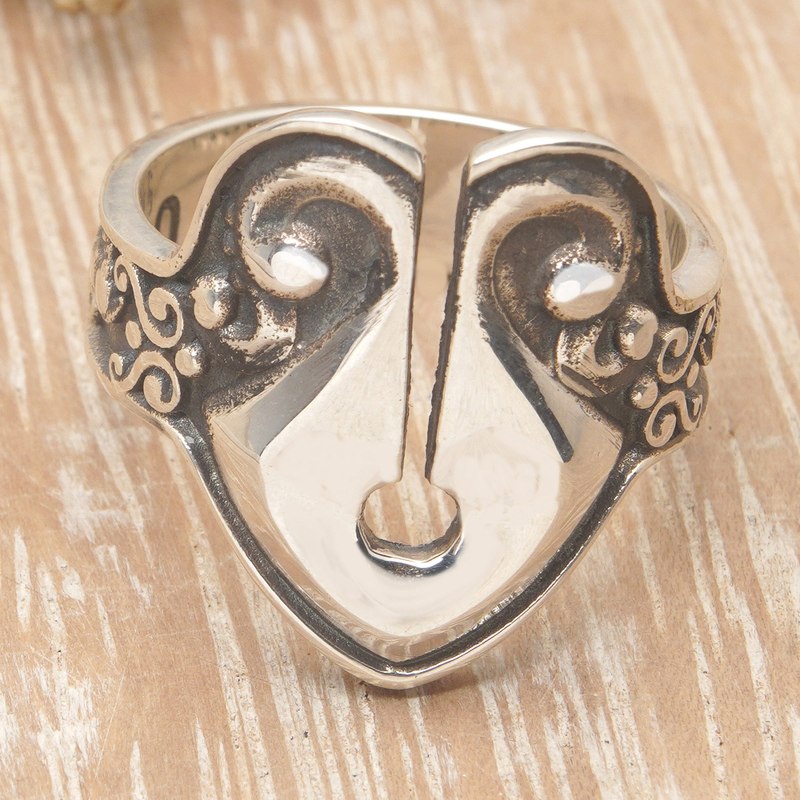 The mamuli is a traditional ornament of the Sumba people, often used as a family heirloom representing the harmonious dynamic of marriage. Inspired by this ancient treasure, Balinese artisan Henry Anthony Sanny creates a dapper sterling silver cocktail ring featuring the motif in a polished finish, honoring the region's cultural wealth.