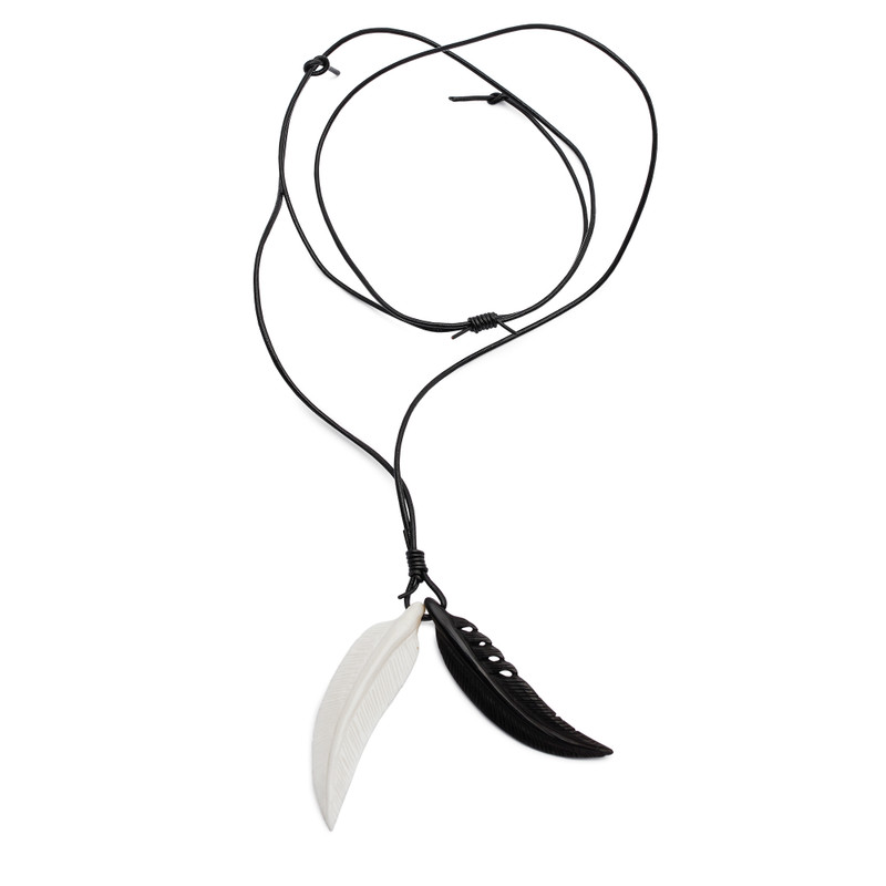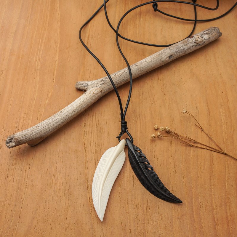 Backed by our 100% Happiness GuaranteeCarved by hand with extraordinary detail, feathers in black and white grace a necklace for men. Bali's Andi Rachmansyah works in bone and horn to create the images and displays the pendants on sleek leather cords. They can be adjusted in length by the sliding knots.