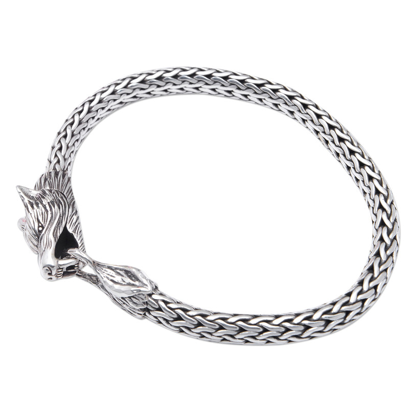 Nature has blessed wolves with a strong sense of leadership, courage and loyalty, as each of them cares for their pack even in dark times. Drawing inspiration from this magnificent species and its ferocious appearance, Balinese artisan Nyoman Ariawan creates a sterling silver chain bracelet with a sturdy structure, and a wolf-themed pendant united to a loop, creating a fascinating illusion.
