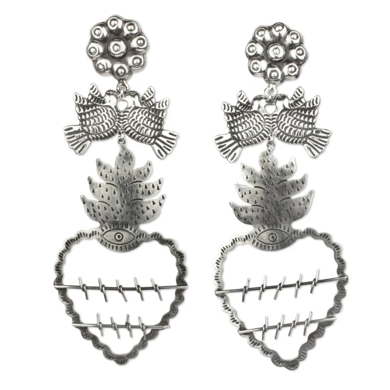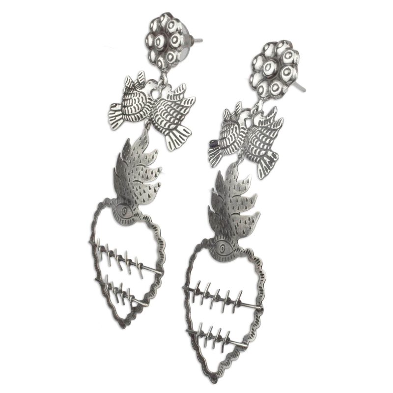 Backed by our 100% Happiness GuaranteeCrowned with gleaming flowers, doves guard all-seeing hearts the dramatic design of these pair of earrings. Maria Belen Nilson celebrates Mexican artistry through her original jewelry collections, creating sterling silver earrings with classic details enhanced by a combined finish.
