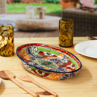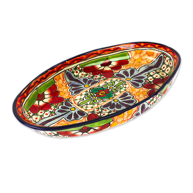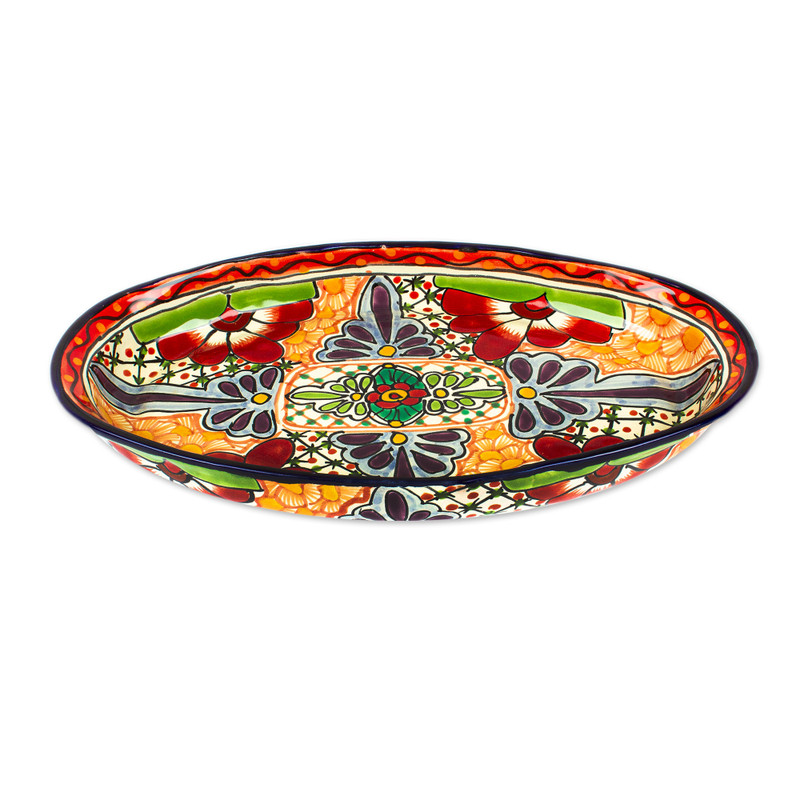 An elegant oblong shape and classic Hacienda details decorate this ceramic platter with Mexico's tradition. Artisan Ivan Martinez paints each floral motif in this sophisticated piece, combining orange, red and blue hues—as warm as the region's evenings.