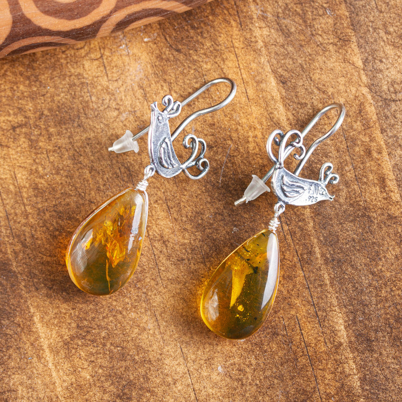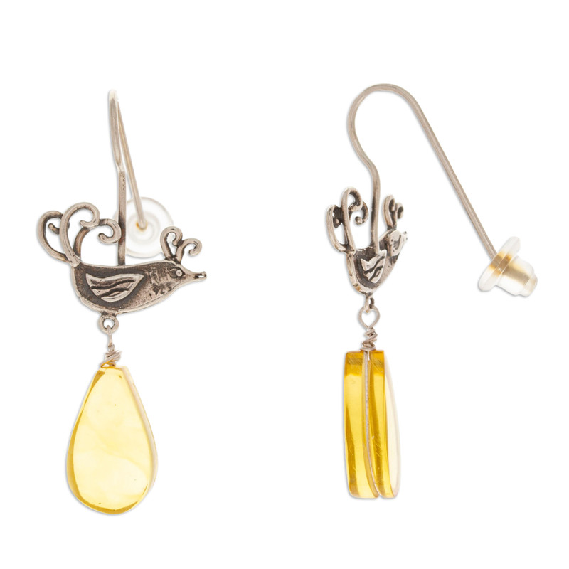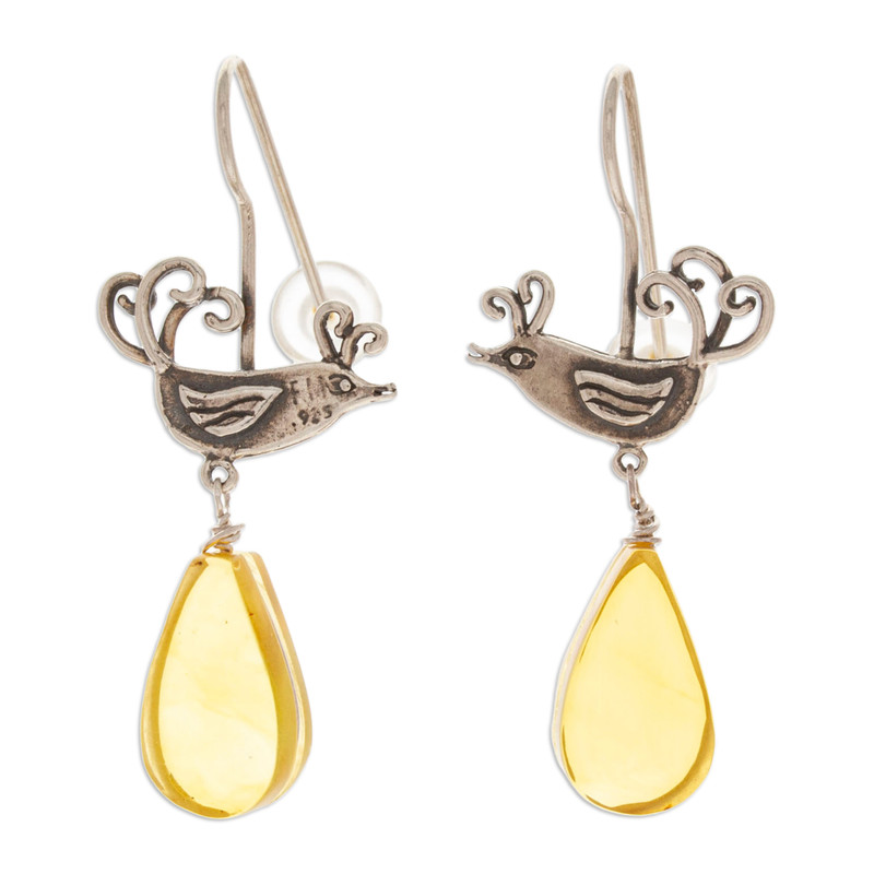 Flirty birds with ornate crests and tails bring gifts of amber in earrings from Mexico. Flora Maria designs these fabulous earrings, which are crafted of sterling silver with lost wax techniques.
