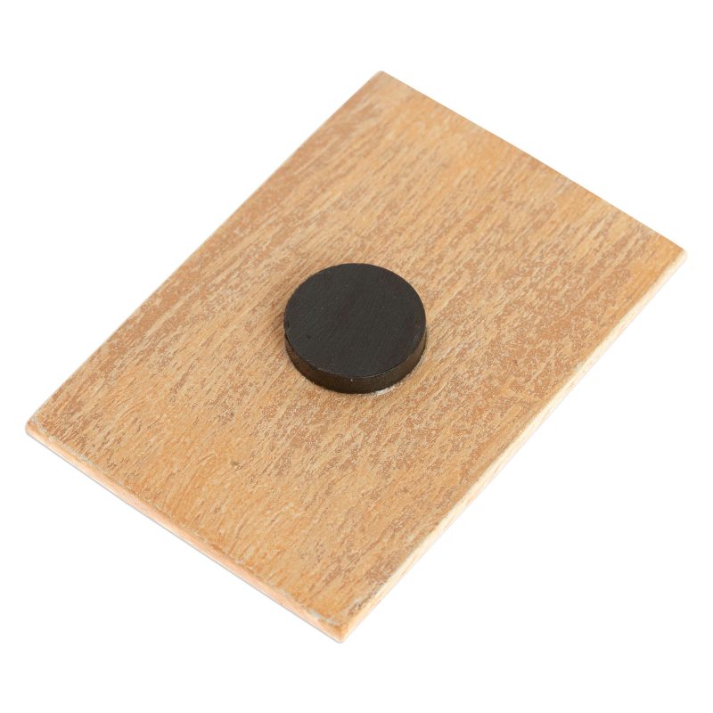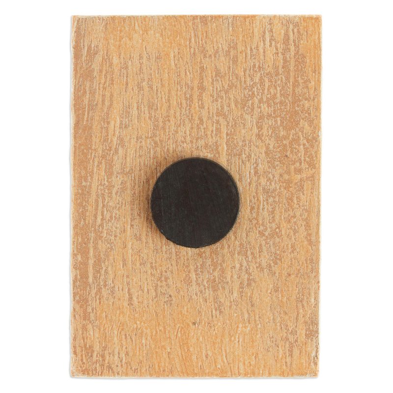 Lotería is a traditional game featuring cards with drawings that are popular in Mexican culture. Inspired by those colorful images, Ana Maria Gonzalez crafts this magnet from pine wood, adding one of those famous cards: a bright reddish sun.