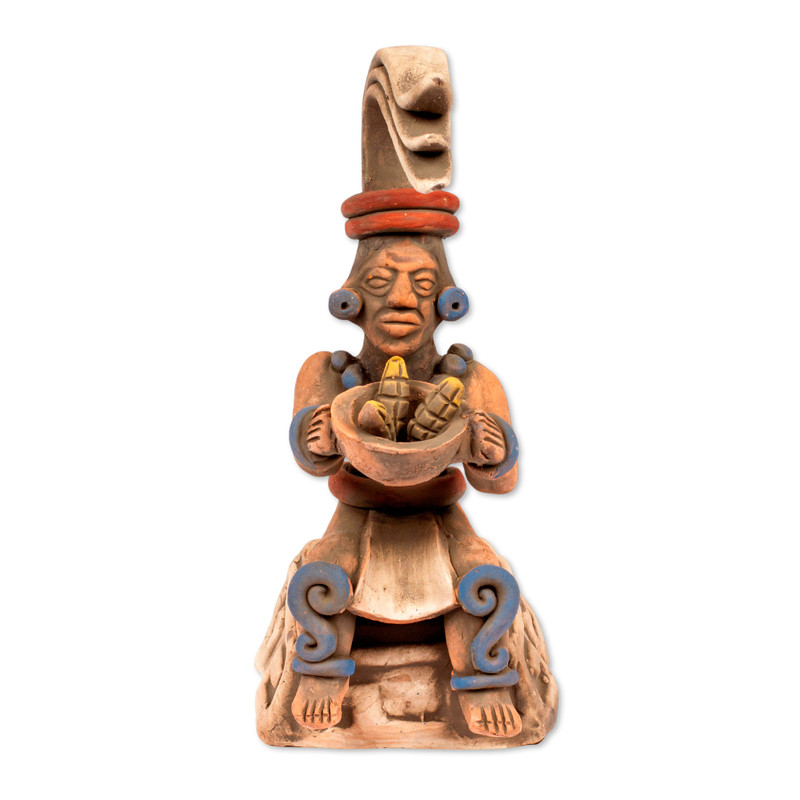 A man in a heavy collar and ornate earplugs wears a graceful headdress made from leaves of corn. In his hands, he holds a bowl of fresh golden maize as an offering of gratitude to the gods. Skilled members of the Angel Ceron Artisan Association create an image in handcrafted ceramic to honor Mexico's pre-Hispanic civilizations. The headdress is similar to that of a Classic Maya sculpture from Copan that can be seen in the Peabody Museum. Their concept may be inspired by a Maya maize God image from the same archaeological site, now on display in the British Museum. However the artisans give the deity the look of an aged man.