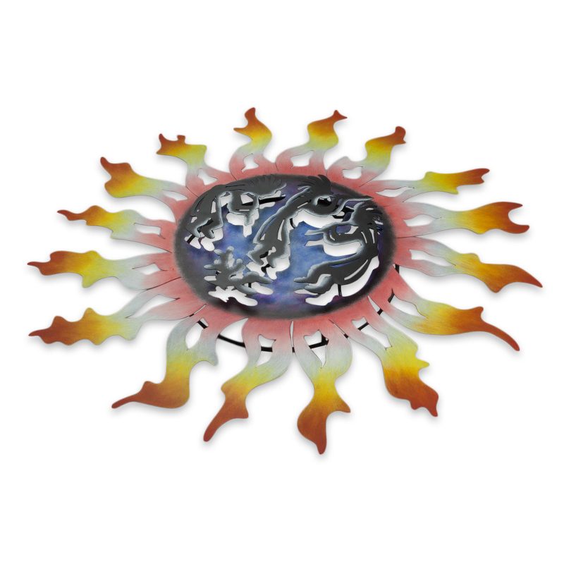 Painted by hand in warm, happy colors, three images of Kokopelli dance and play a song for the sun. A prehistoric image, this deity is usually depicted with a humped back, playing a flute. Legends suggest Kokopelli was a Toltec trader who traveled from central Mexico to the southwestern deserts and mountains of the U.S.; there he is featured in the form of rock art dating back thousands of years. Alejandro de Esesarte depicts him in a handcrafted wall sculpture.
