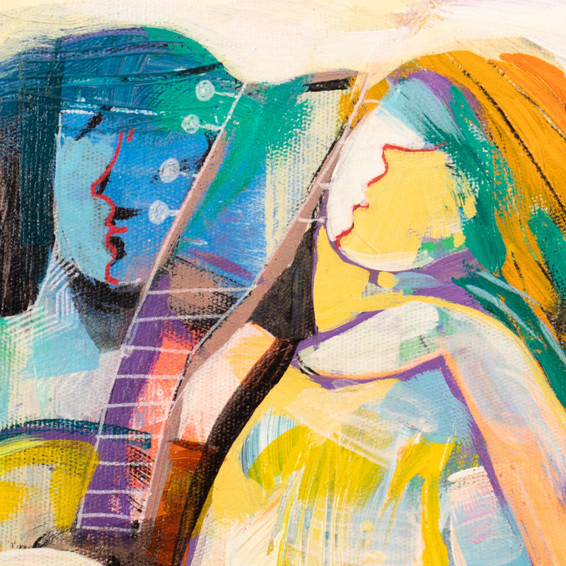 Delivery EstimateAn abstract depiction of a woman and a man dancing and holding a guitar conveys the profound connection between two people in love. Peruvian artist Reyna de la Barra's alluring oil composition is a hypnotic symphony of contrasting warm and bright shades. The couple's contours are delicately blurred, hinting at a connection that transcends the physical and ventures into emotional and spiritual depths.Titled El Baile del Amor in Spanish.