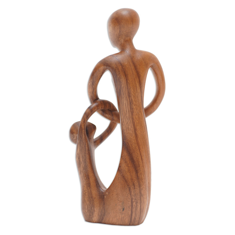 Emanating tenderness and love, the heartfelt dance of a father and his son is portrayed in this endearing sculpture skillfully carved by hand from suar wood in Bali. This exquisite abstract design presented by Eka shines brilliantly with its flawlessly polished finish, claiming its rightful place as the captivating centerpiece in any space.