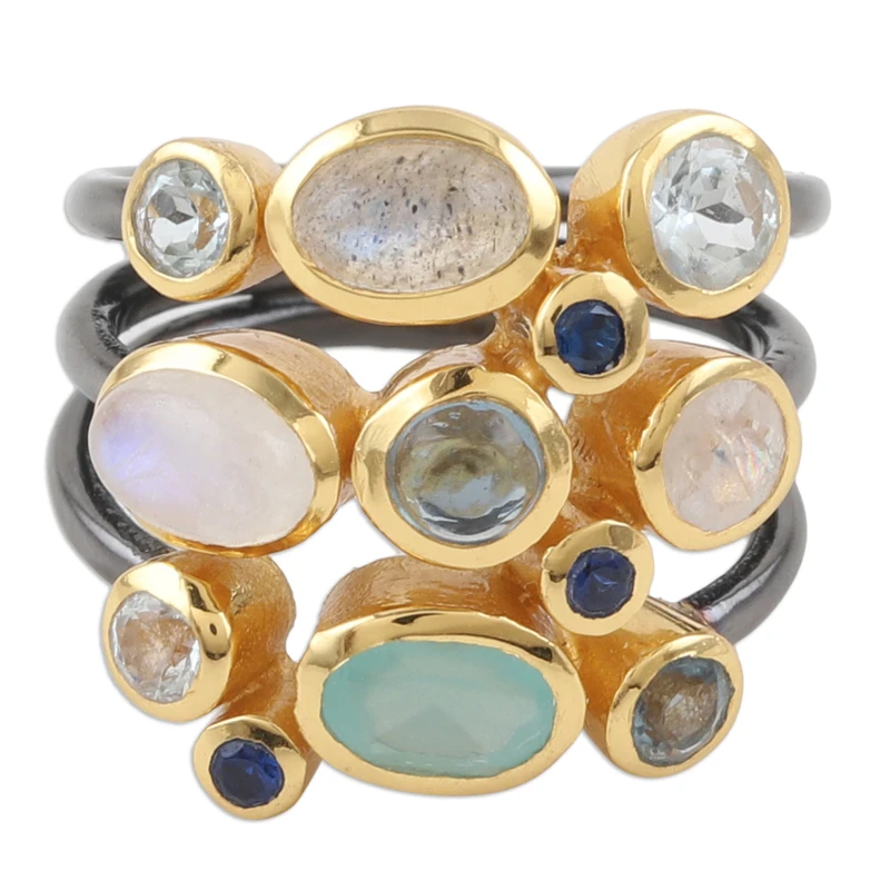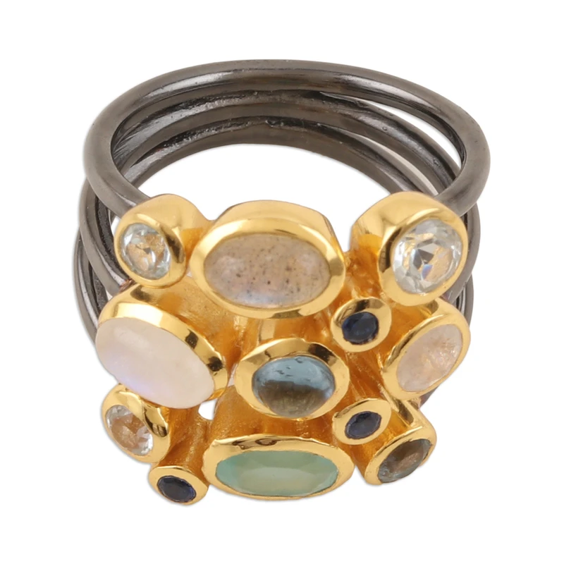 Featuring a dazzling combination of oval and round rainbow moonstone, iolite, blue topaz, onyx and labradorite gemstones set in 18k gold-plated bezels, this cocktail ring is a true masterpiece from the artisans of India. Each gemstone is selected with precision to create a symphony of colors and sizes, perfect for the fashion-forward woman. But the beauty of this breathtaking ring by Neetu Barathi doesn't stop there: the band is made of three oxidized sterling silver strands adding an edgy twist to the design.