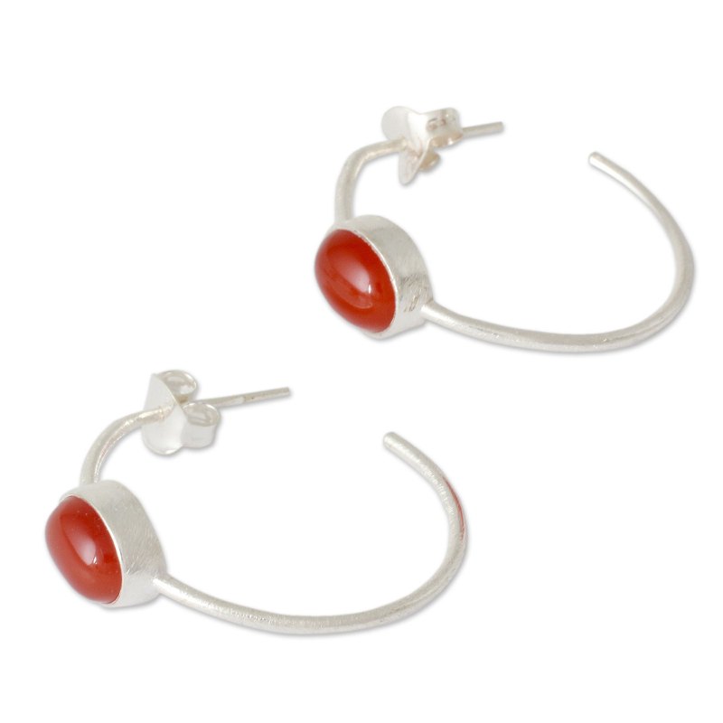 From Bhavesh, this minimalist style exalts the beauty of enhanced red onyx. The radiant gemstones pose on silver half hoop earrings.