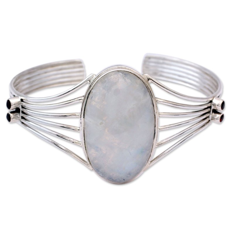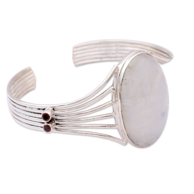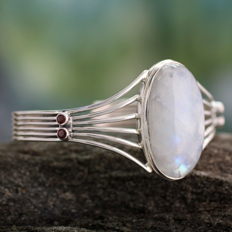 Rainbow moonstone is mesmerizing in this beautiful design by Shanker. The bracelet juxtaposes the gem with shining sterling silver, making the cuff a glamorous fashion accessory. Twin garnets adorn each side.
