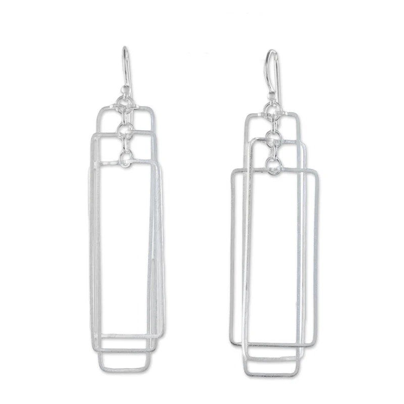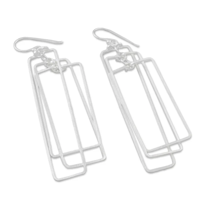 Crafted of sterling silver with a matte finish, three rectangles dangle within one another in a pair of earrings from Thailand. Lalana designs these modern earrings.