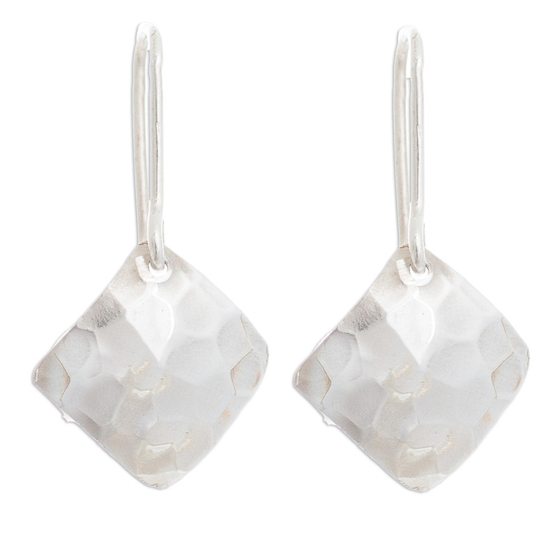 Designed by Peru's Marina Guzman, these dangle earrings are handcrafted of sterling silver. Two modern squares are realized with a fascinating hammered finish.