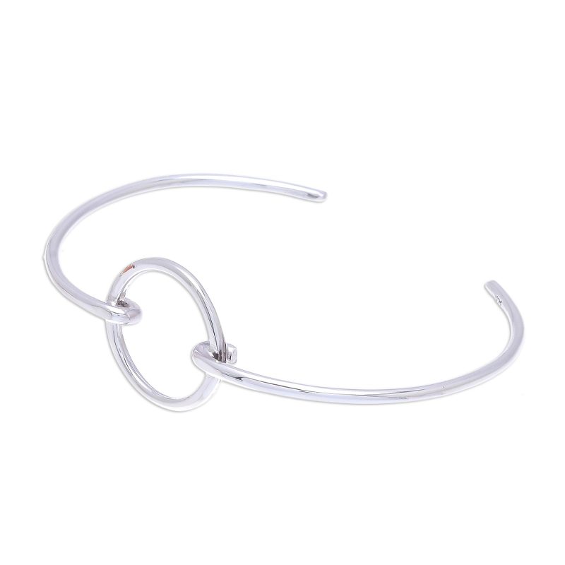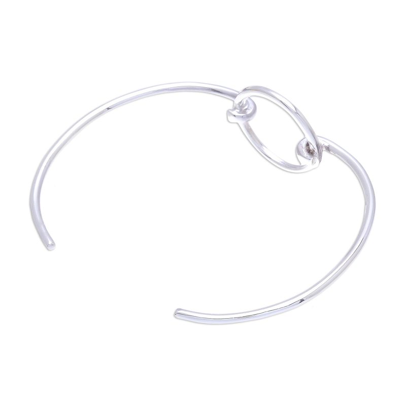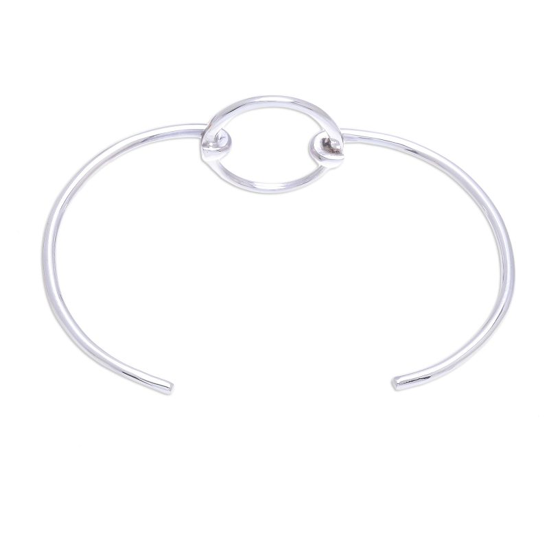 Crafted from sterling silver with a gleaming high-polish finish, this modern cuff bracelet from Thailand is presented by Aoy. At the center, a circular pendant leaves open space.
