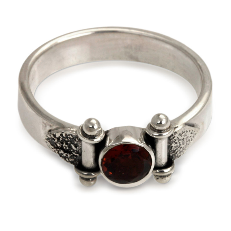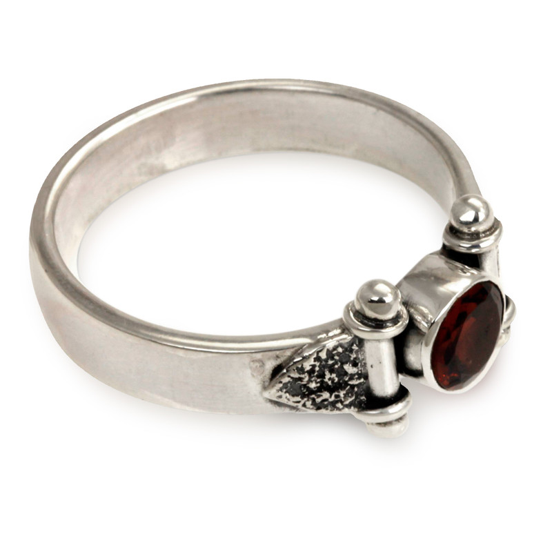 This ring by Nyoman Rena exudes mystic elegance with its garnet eye glowing with powerful beauty. Argent scrolls hold the radiant gem as Rena crafts the ring from sterling silver.