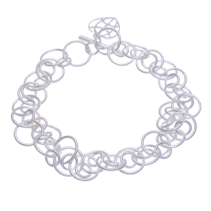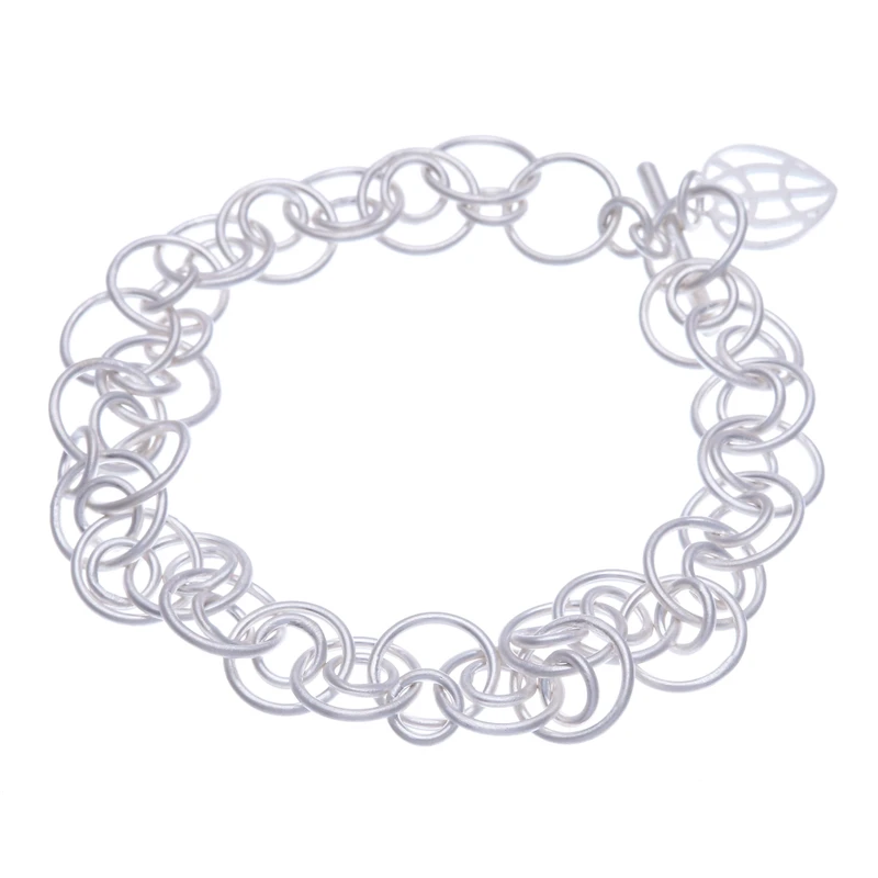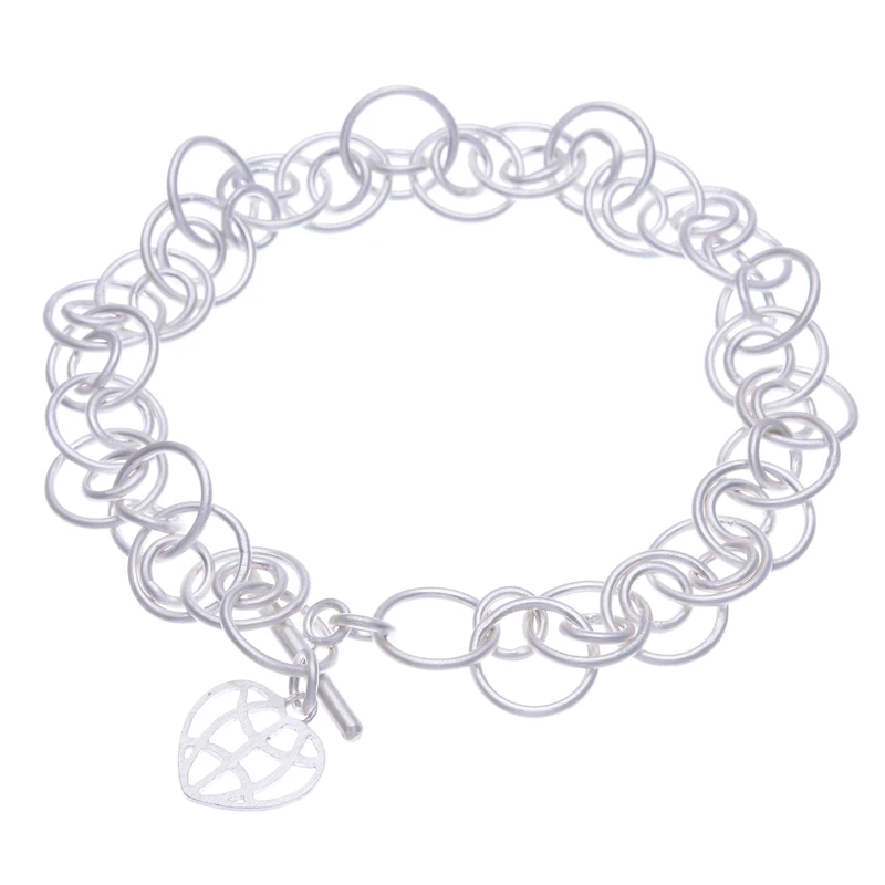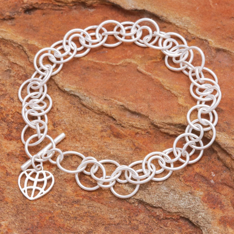 This sterling silver link bracelet is a modern creation from Thailand, handcrafted with dedication in Sarote Lochotinunt's workshop. With a myriad of loops embellishing the intricate design, a cute heart-shaped globe dangles gracefully from the accessory, symbolizing unconditional love.