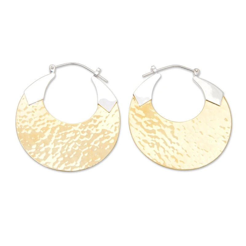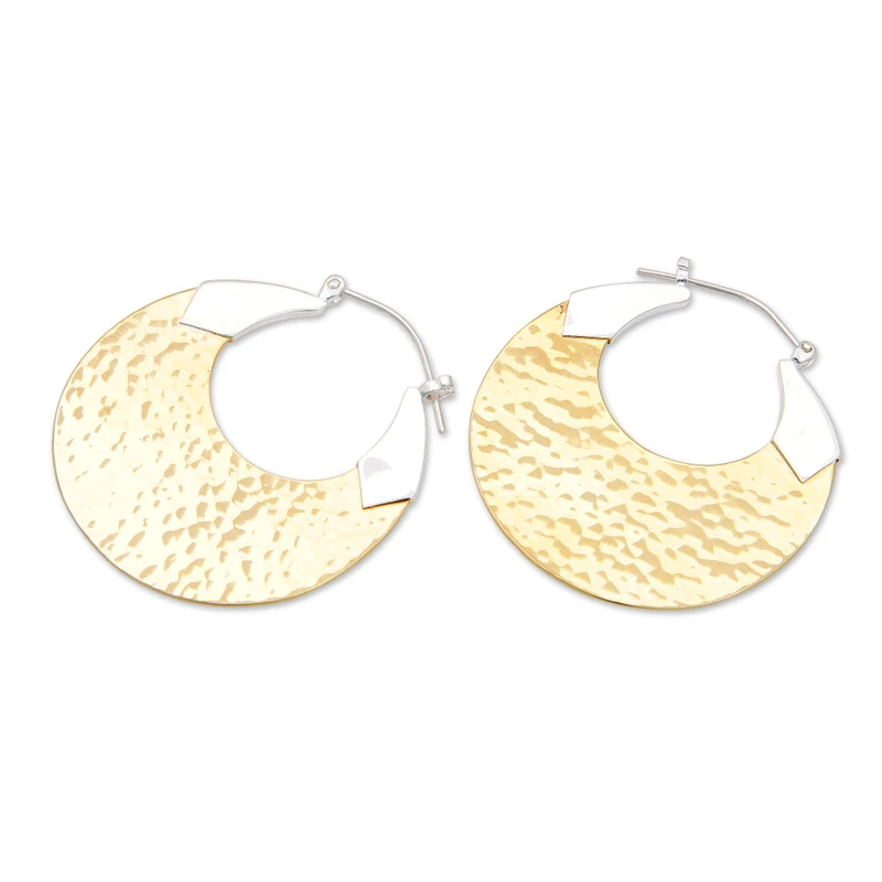 This majestic pair of hoop earrings crafted by artisan Nyoman Nartawan of Bali features a hammered finish that enriches the bewitching 22k gold-plated moon shape that characterizes the design, creating a glamorous aura. Made with sterling silver accents, the accessory also comes with convenient saddleback clasps that allow you to wear the design in all its refined beauty.