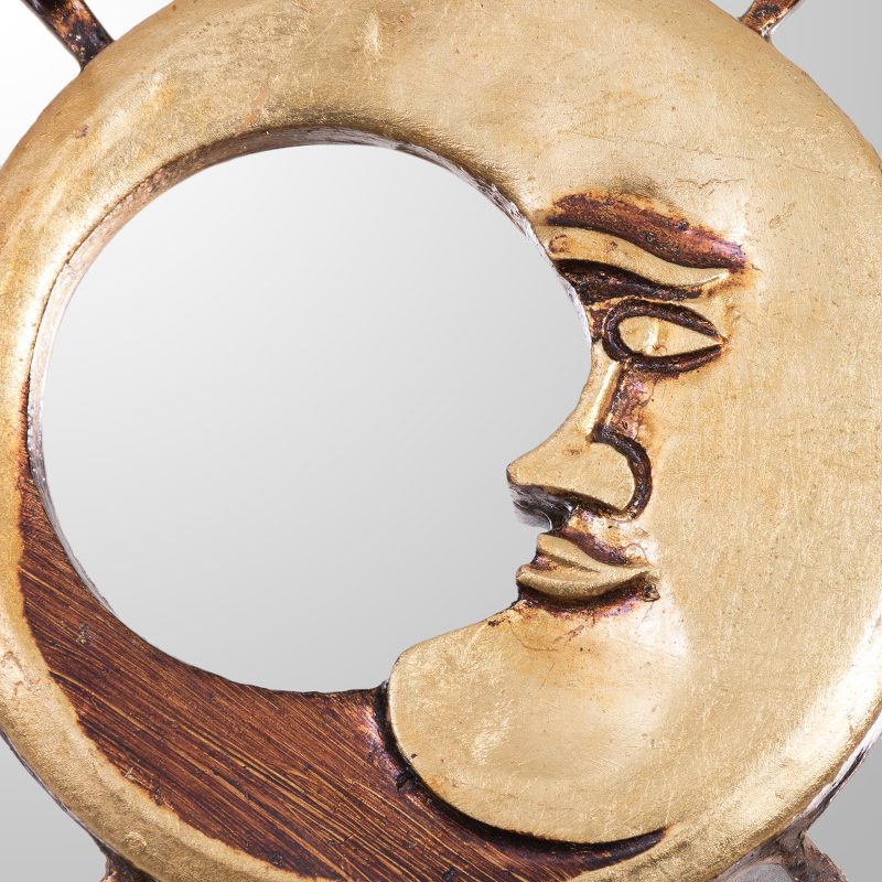 Backed by our 100% Happiness GuaranteeHandcrafted of mohena wood adorned with bronze leaf, this radiant wall mirror depicts an eclipsed crescent moon. Peruvian artisan Gliseria Soto creates the mirror, featuring intricate rays around the edges with an antiqued finish. This piece of wall decor is completed with mirror accents that surround the central mirror couched within the moon's curve.
