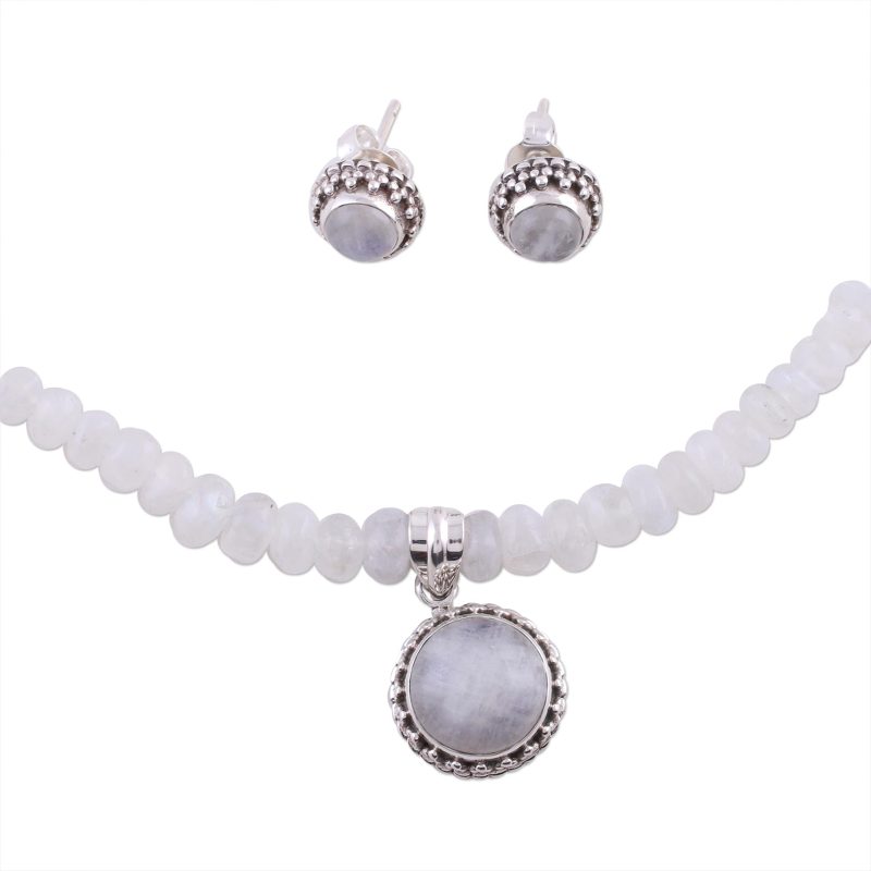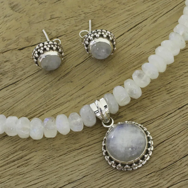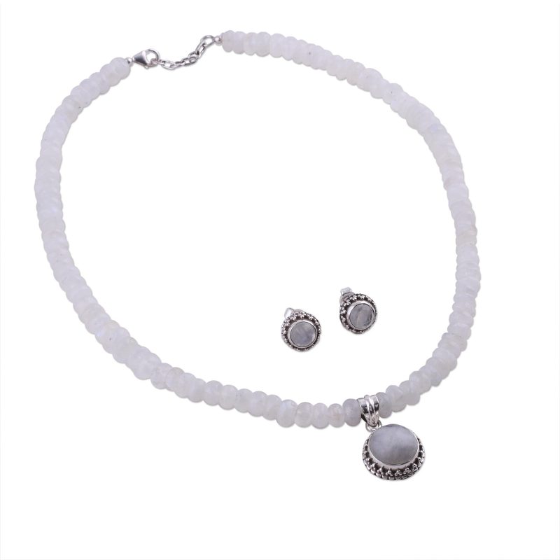 The colorful translucency of moonstone glows eternal in the exclusive design of this jewelry set by Neeru Goel. The pendant and earrings glow like magical moons with sterling silver as their ornate halos.