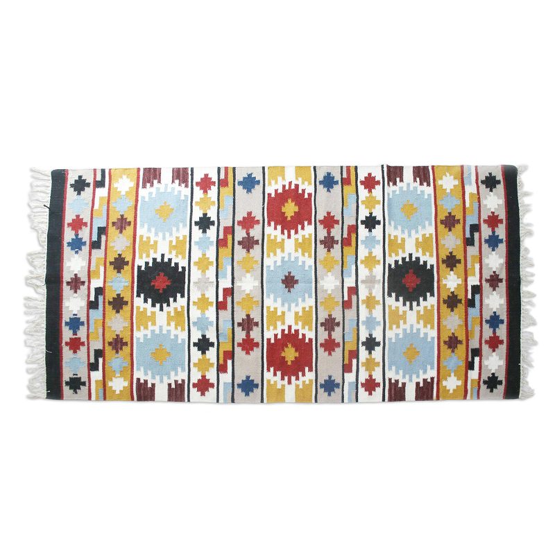 Sonik Sethi of India presents a handwoven wool rug with a lively geometric pattern. In warm tones of yellow, black, brown, white, blue, red and oat, the artisans weave different sized bands of geometric motifs, including small stepped-fret diamonds, larger stepped-fret shapes, and angular blocks. The rug is finished with ivory fringe.