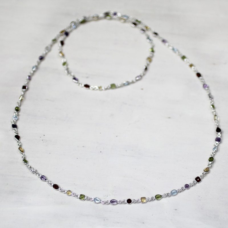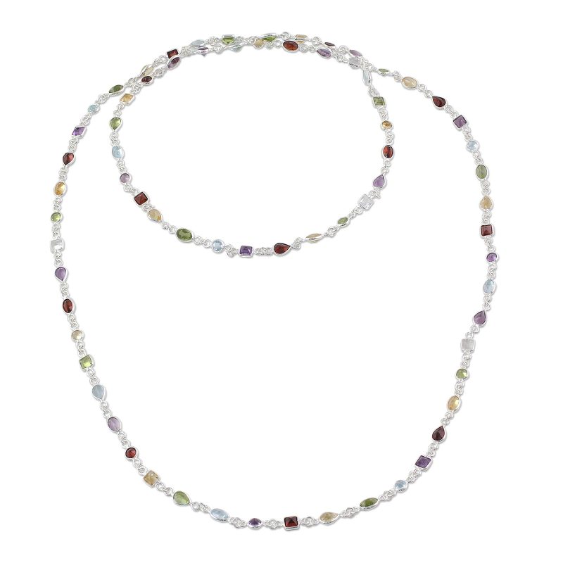 This handcrafted long sterling silver necklace by Bhavesh features a vibrant line-up of faceted gemstones – garnet, amethyst, blue topaz, citrine, peridot, and quartz—totaling more than 25 carats. Wear it long for a laid-back vibe or double it up for a layered look. Full of sparkle, it's a free-spirited mix of color and artisan charm.